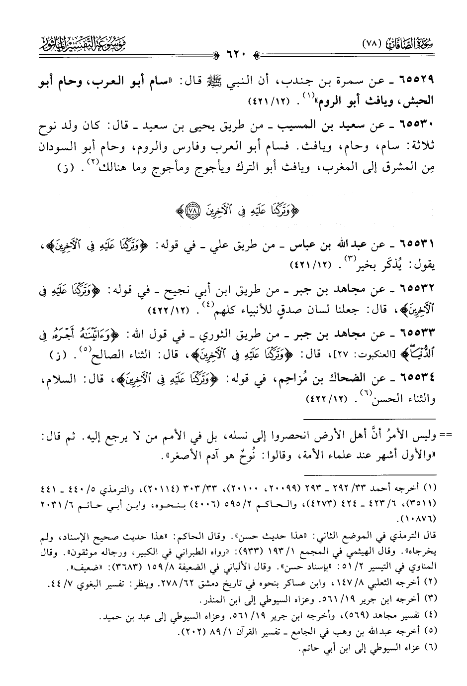 ٦٥٥٢٩ - عن سمرة بن جندب، أن النبي - صلى الله عليه وسلم - قال: «سام أبو العرب، وحام أبو الحبش، ويافث أبو الروم» (¬١). (١٢/ ٤٢١)