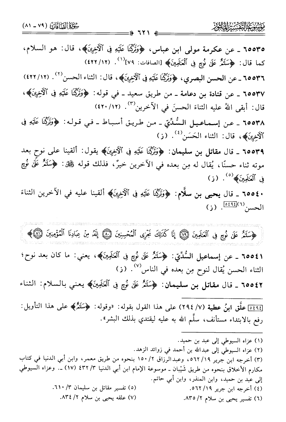 ٦٥٥٣٥ - عن عكرمة مولى ابن عباس، {وتَرَكْنا عَلَيْهِ فِي الآخِرِين}، قال: هو السلام، كما قال: {سَلامٌ عَلى نُوحٍ فِي العالَمِينَ} [الصافات: ٧٩] (¬١). (١٢/ ٤٢٢)