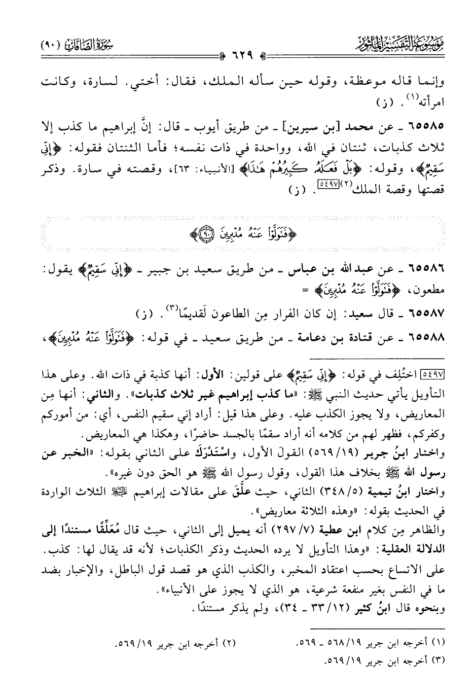 ٦٥٥٨٥ - عن محمد [بن سيرين]-من طريق أيوب- قال: إنّ إبراهيم ما كذب إلا ثلاث كذبات، ثنتان في الله، وواحدة في ذات نفسه؛ فأما الثنتان فقوله: {إنِّي سَقِيمٌ}، وقوله: {بَلْ فَعَلَهُ كَبِيرُهُمْ هَذا}، وقصته في سارة. وذكر قصتها وقصة الملك (¬٢) [٥٤٩٧]. (ز)