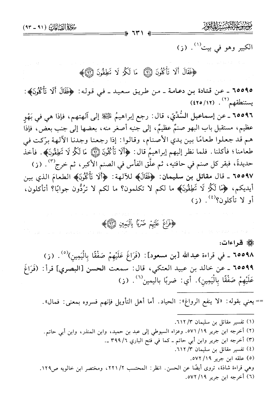 ٦٥٥٩٦ - عن إسماعيل السُّدِّيّ، قال: رجع إبراهيمُ - عليه السلام - إلى آلهتهم، فإذا هي في بَهْوٍ عظيم، مستقبل باب البهو صنمٌ عظيمٌ، إلى جنبه أصغر منه، بعضها إلى جنب بعض، فإذا هم قد جعلوا طعامًا بين يدي الأصنام، وقالوا: إذا رجعنا وجدنا الآلهة برّكت في طعامنا؛ فأكلنا. فلما نظر إليهم إبراهيمُ قال: {ألا تَأْكُلُونَ* ما لَكُمْ لا تَنْطِقُونَ}. فأخذ حديدةً، فبقر كل صنم في حافتيه، ثم علَّق الفأس في الصنم الأكبر، ثم خرج (¬٣). (ز)