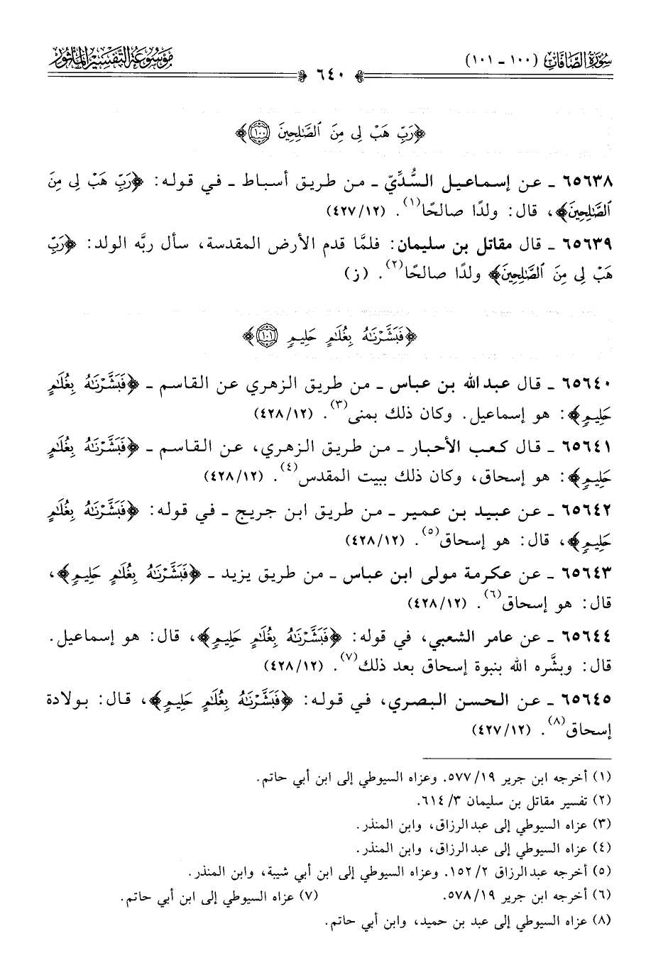 ٦٥٦٤٤ - عن عامر الشعبي، في قوله: {فَبَشَّرْناهُ بِغُلامٍ حَلِيمٍ}، قال: هو إسماعيل. قال: وبشَّره الله بنبوة إسحاق بعد ذلك (¬٧). (١٢/ ٤٢٨)