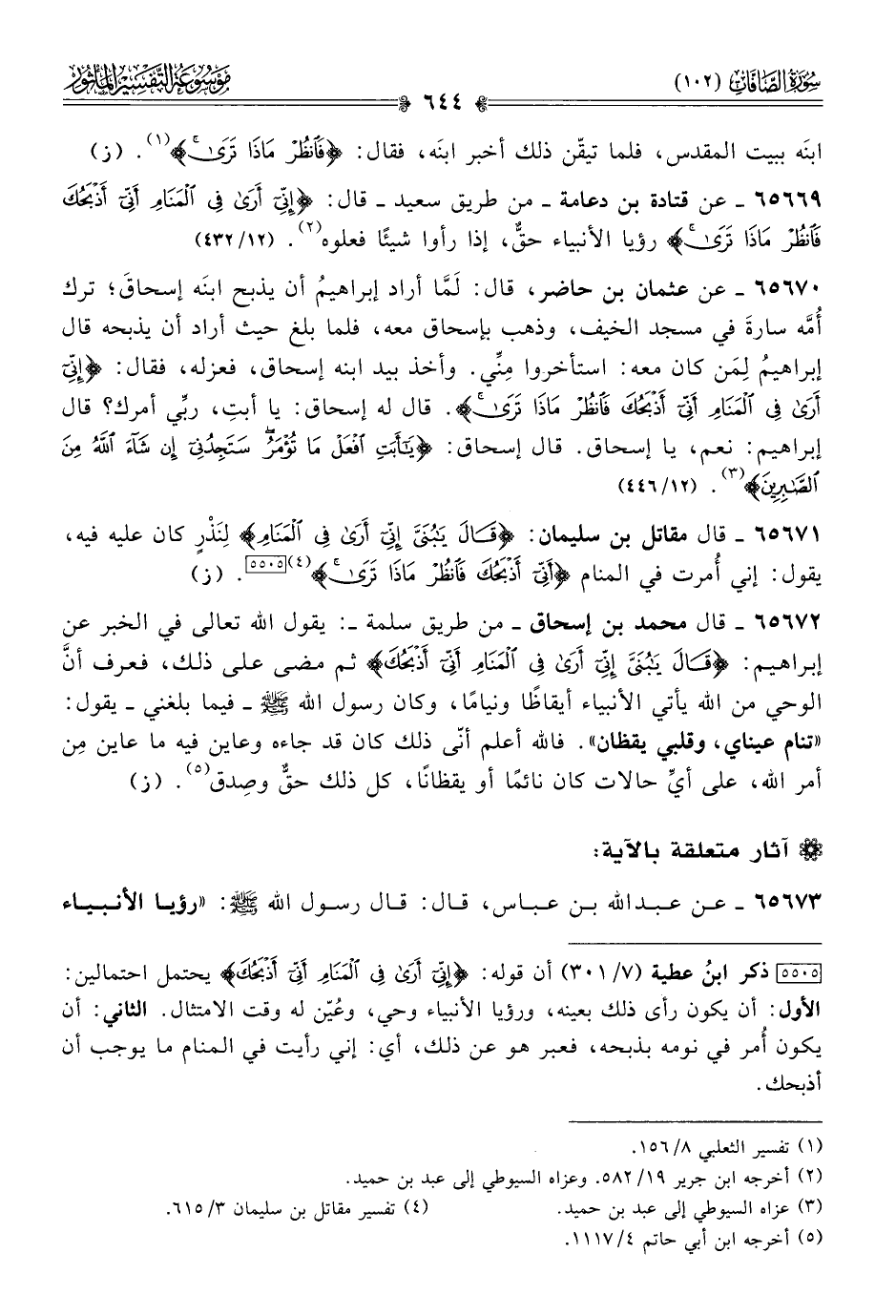 ٦٥٦٦٩ - عن قتادة بن دعامة -من طريق سعيد- قال: {إنِّي أرى فِي المَنامِ أنِّي أذْبَحُكَ فانْظُرْ ماذا تَرى} رؤيا الأنبياء حقٌّ، إذا رأوا شيئًا فعلوه (¬٢). (١٢/ ٤٣٢)