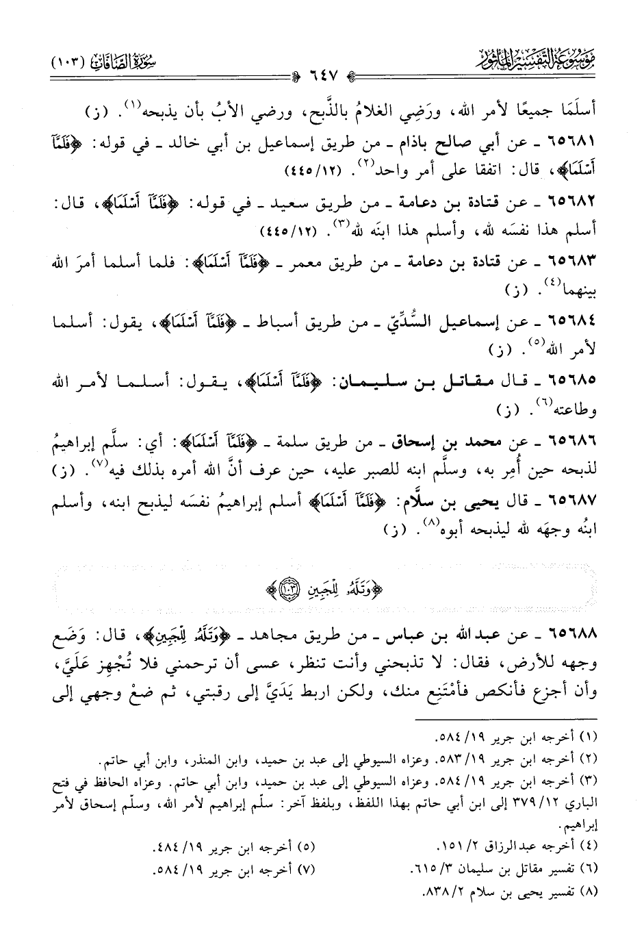 (¬٣) أخرجه ابن جرير ١٩/ ٥٨٤. وعزاه السيوطي إلى عبد بن حميد، وابن أبي حاتم. وعزاه الحافظ في فتح الباري ١٢/ ٣٧٩ إلى ابن أبي حاتم بهذا اللفظ، وبلفظ آخر: سلّم إبراهيم لأمر الله، وسلّم إسحاق لأمر إبراهيم.