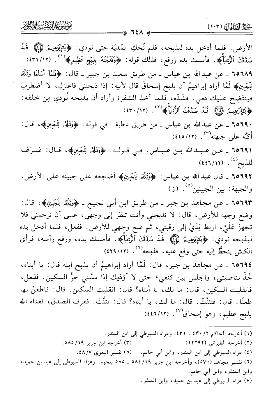 ٦٥٦٩٣ - عن مجاهد بن جبر -من طريق ابن أبي نجيح- {وتَلَّهُ لِلْجَبِينِ}، قال: وضع وجهه للأرض، قال: لا تذبحني وأنت تنظر إلى وجهي، عسى أن ترحمني فلا تجهزَ عَلَيَّ، اربط يَدَيَّ إلى رقبتي، ثم ضع وجهي للأرض. ففعل، فلما أدخل يده ليذبحه نودي: {يا إبْراهِيمُ * قَدْ صَدَّقْتَ الرُّؤْيا}. فأمسك يده، ورفع رأسه، فرأى الكبش ينحطُّ إليه حتى وقع عليه، فذبحه (¬٦). (١٢/ ٤٢٩)