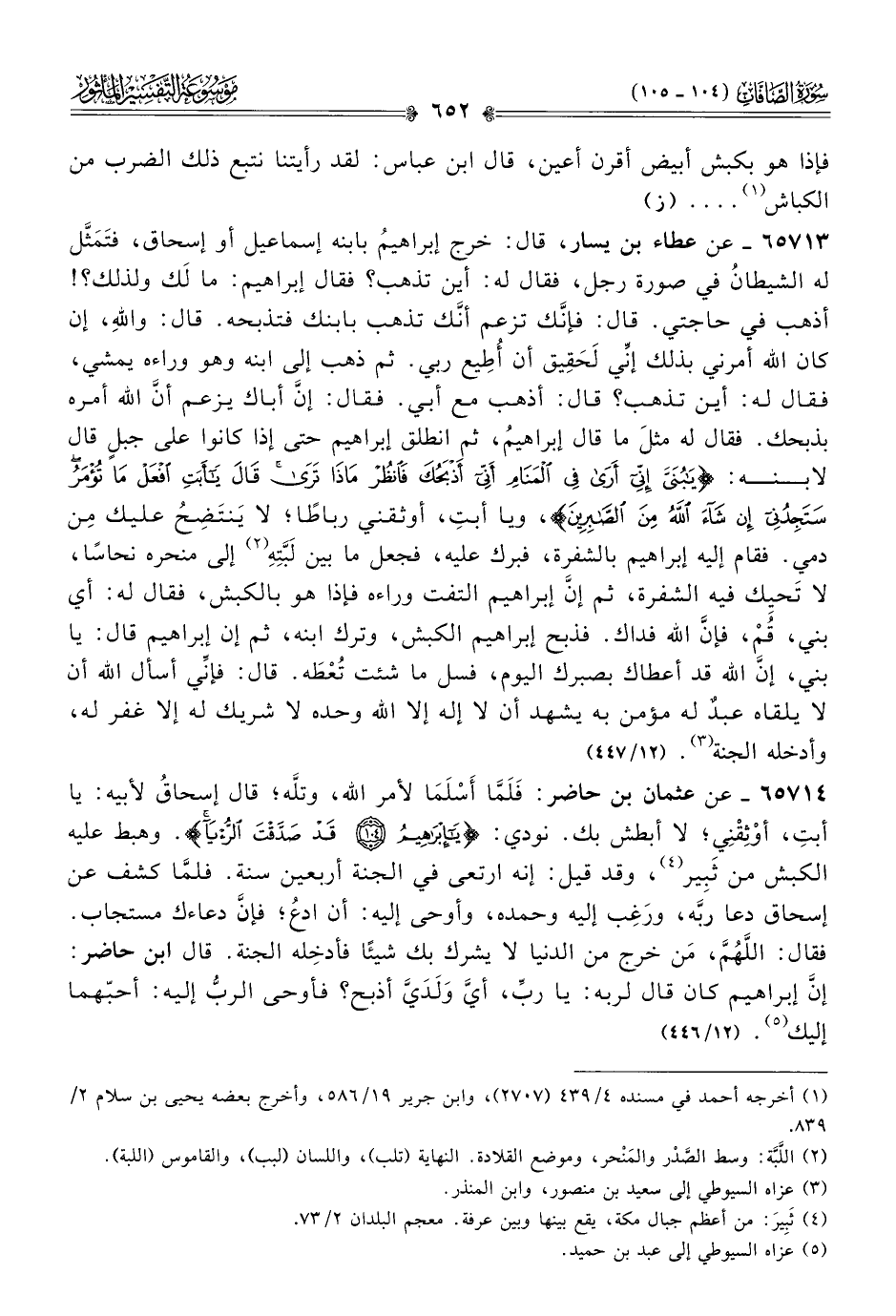 ٦٥٧١٣ - عن عطاء بن يسار، قال: خرج إبراهيمُ بابنه إسماعيل أو إسحاق، فتَمَثَّل له الشيطانُ في صورة رجل، فقال له: أين تذهب؟ فقال إبراهيم: ما لَك ولذلك؟! أذهب في حاجتي. قال: فإنّك تزعم أنّك تذهب بابنك فتذبحه. قال: واللهِ، إن كان الله أمرني بذلك إنِّي لَحَقِيق أن أُطِيع ربي. ثم ذهب إلى ابنه وهو وراءه يمشي، فقال له: أين تذهب؟ قال: أذهب مع أبي. فقال: إنّ أباك يزعم أنّ الله أمره بذبحك. فقال له مثلَ ما قال إبراهيمُ، ثم انطلق إبراهيم حتى إذا كانوا على جبلٍ قال لابنه: {يا بُنَيَّ إنِّي أرى فِي المَنامِ أنِّي أذْبَحُكَ فانْظُرْ ماذا تَرى قالَ يا أبَتِ افْعَلْ ما تُؤْمَرُ سَتَجِدُنِي إنْ شاءَ اللَّهُ مِنَ الصّابِرِينَ}، ويا أبتِ، أوثقني رباطًا؛ لا يَنتَضِحُ عليك مِن دمي. فقام إليه إبراهيم بالشفرة، فبرك عليه، فجعل ما بين لَبَّتِهِ (¬٢) إلى منحره نحاسًا، لا تَحيِك فيه الشفرة، ثم إنّ إبراهيم التفت وراءه فإذا هو بالكبش، فقال له: أي بني، قُمْ، فإنّ الله فداك. فذبح إبراهيم الكبش، وترك ابنه، ثم إن إبراهيم قال: يا بني، إنّ الله قد أعطاك بصبرك اليوم، فسل ما شئت تُعْطَه. قال: فإنِّي أسأل الله أن لا يلقاه عبدٌ له مؤمن به يشهد أن لا إله إلا الله وحده لا شريك له إلا غفر له، وأدخله الجنة (¬٣). (١٢/ ٤٤٧)
