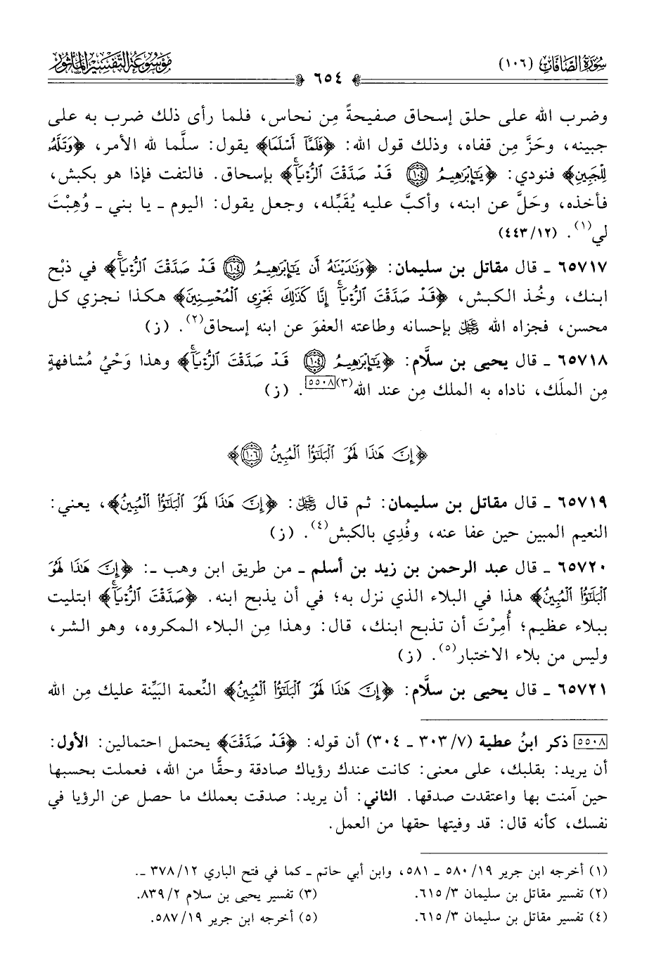 ٦٥٧١٧ - قال مقاتل بن سليمان: {ونادَيْناهُ أنْ يا إبْراهِيمُ * قَدْ صَدَّقْتَ الرُّؤْيا} في ذبْح ابنك، وخُذ الكبش، {إنّا كَذَلِكَ نَجْزِي المُحْسِنِينَ} هكذا نجزي كل محسن، فجزاه الله - عز وجل - بإحسانه وطاعته العفوَ عن ابنه إسحاق (¬٢). (ز)