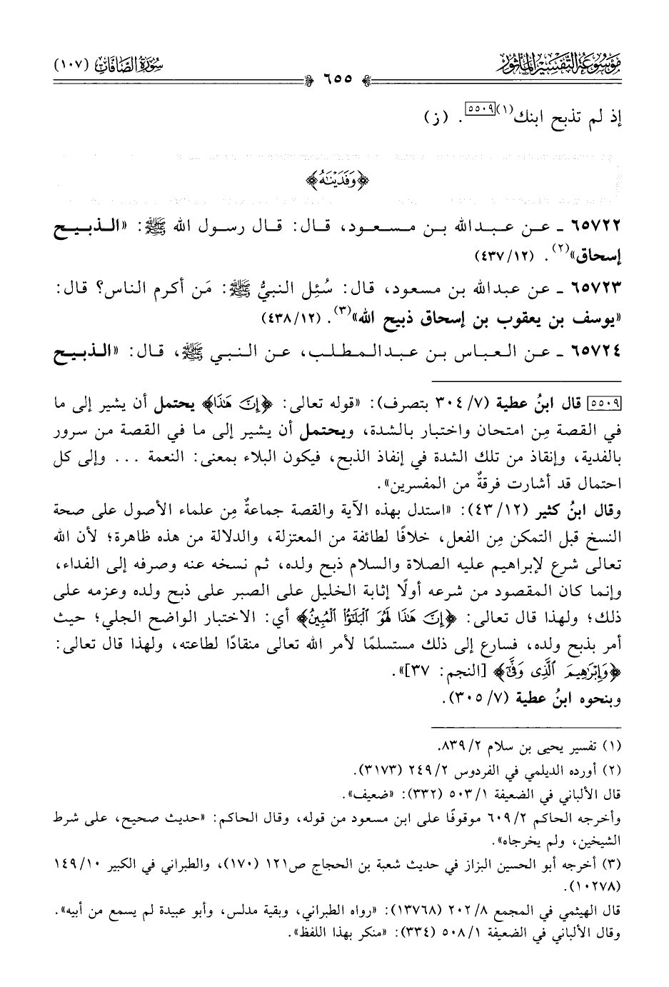 ٦٥٧٢٢ - عن عبد الله بن مسعود، قال: قال رسول الله - صلى الله عليه وسلم -: «الذبيح إسحاق» (¬٢). (١٢/ ٤٣٧)