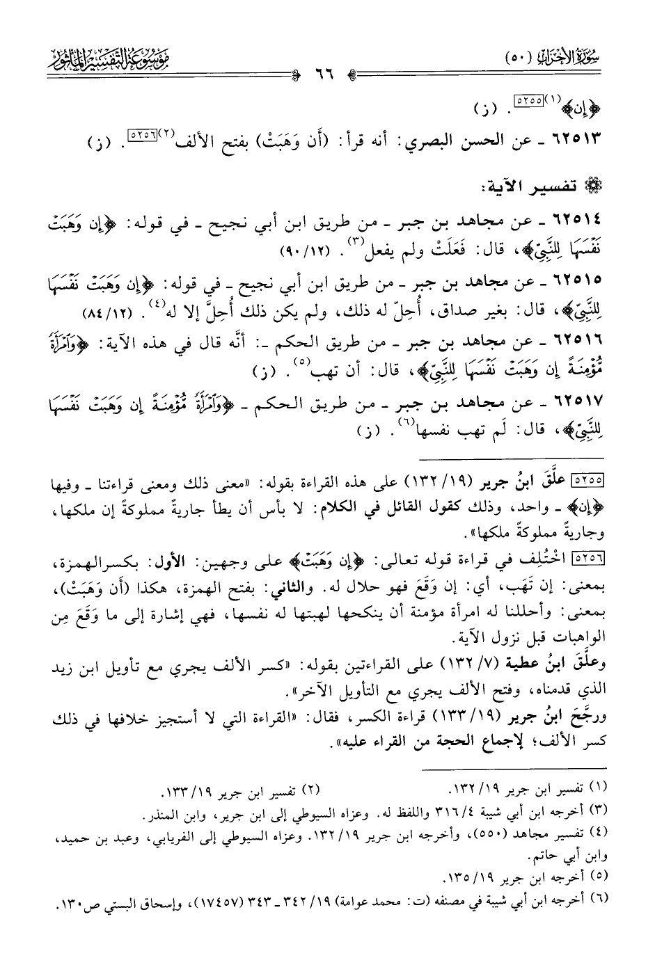٦٢٥١٤ - عن مجاهد بن جبر -من طريق ابن أبي نجيح- في قوله: {إنْ وهَبَتْ نَفْسَها لِلنَّبِيِّ}، قال: فَعَلَتْ ولم يفعل (¬٣). (١٢/ ٩٠)