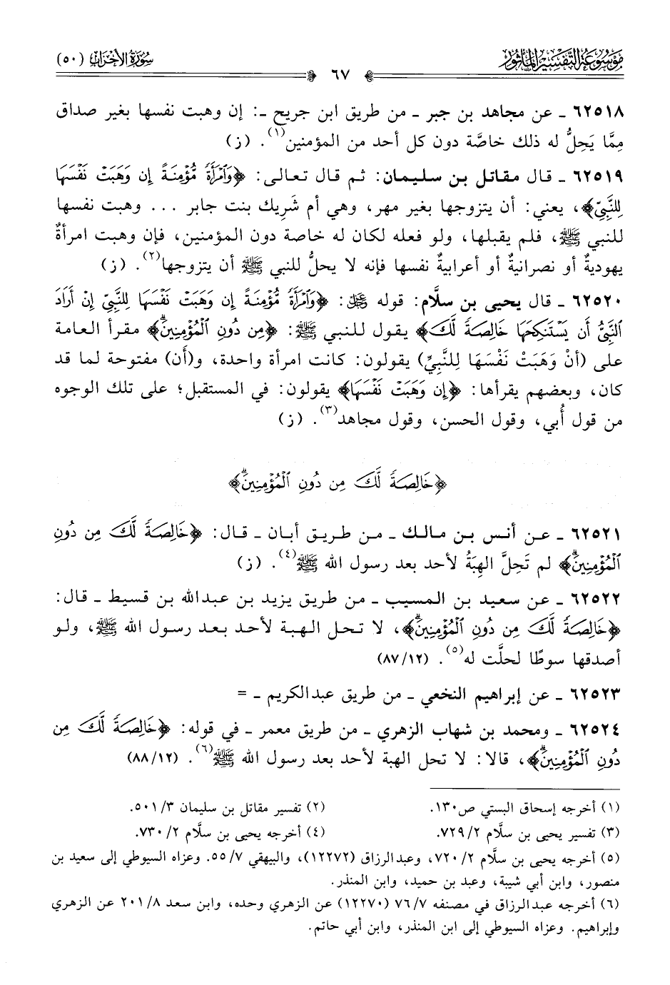 ٦٢٥٢٤ - ومحمد بن شهاب الزهري -من طريق معمر- في قوله: {خالِصَةً لَكَ مِن دُونِ المُؤْمِنِينَ}، قالا: لا تحل الهبة لأحد بعد رسول الله - صلى الله عليه وسلم - (¬٦). (١٢/ ٨٨)