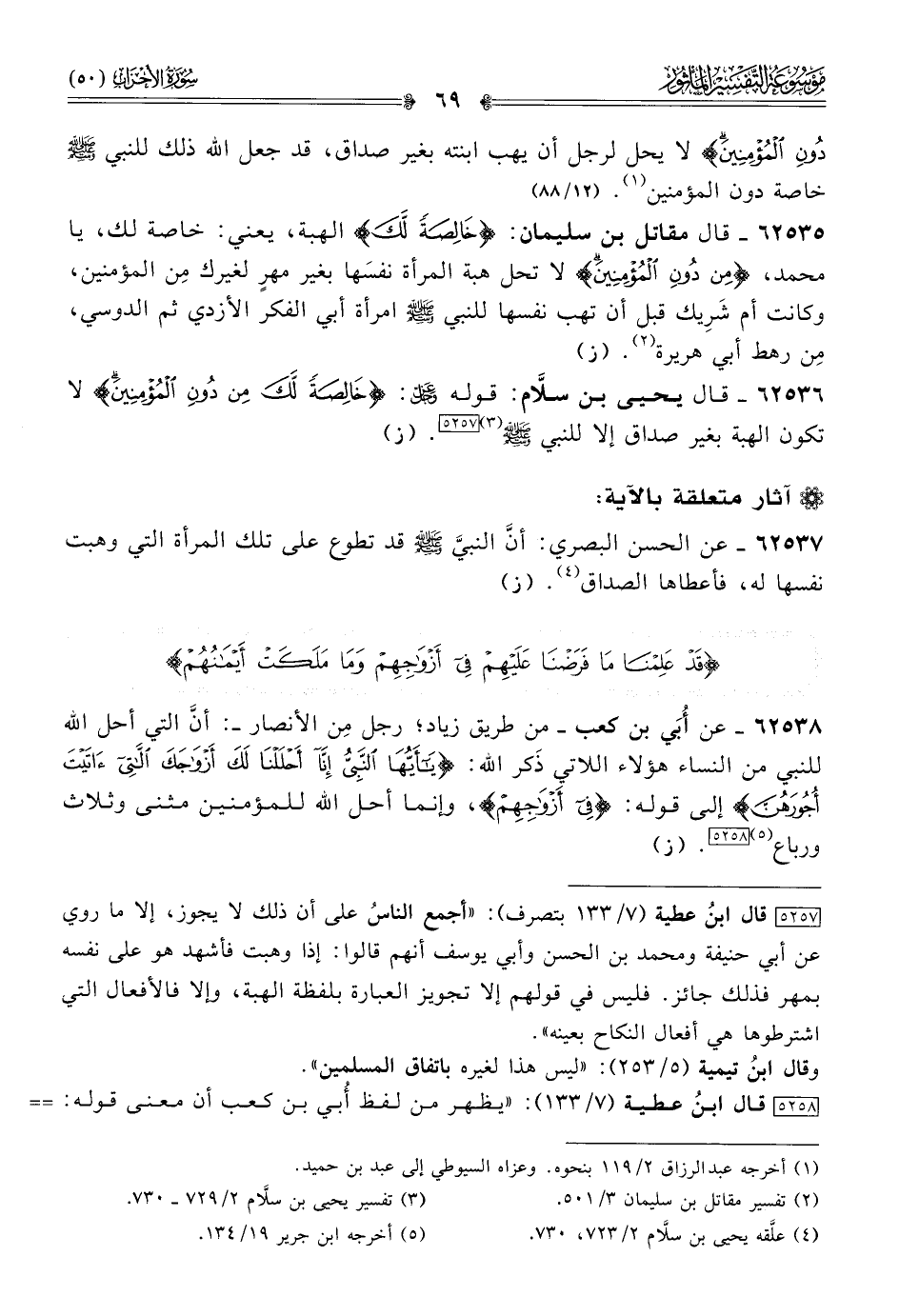 ٦٢٥٣٦ - قال يحيى بن سلّام: قوله - عز وجل -: {خالِصَةً لَكَ مِن دُونِ المُؤْمِنِينَ} لا تكون الهبة بغير صداق إلا للنبي - صلى الله عليه وسلم - (¬٣) [٥٢٥٧]. (ز)