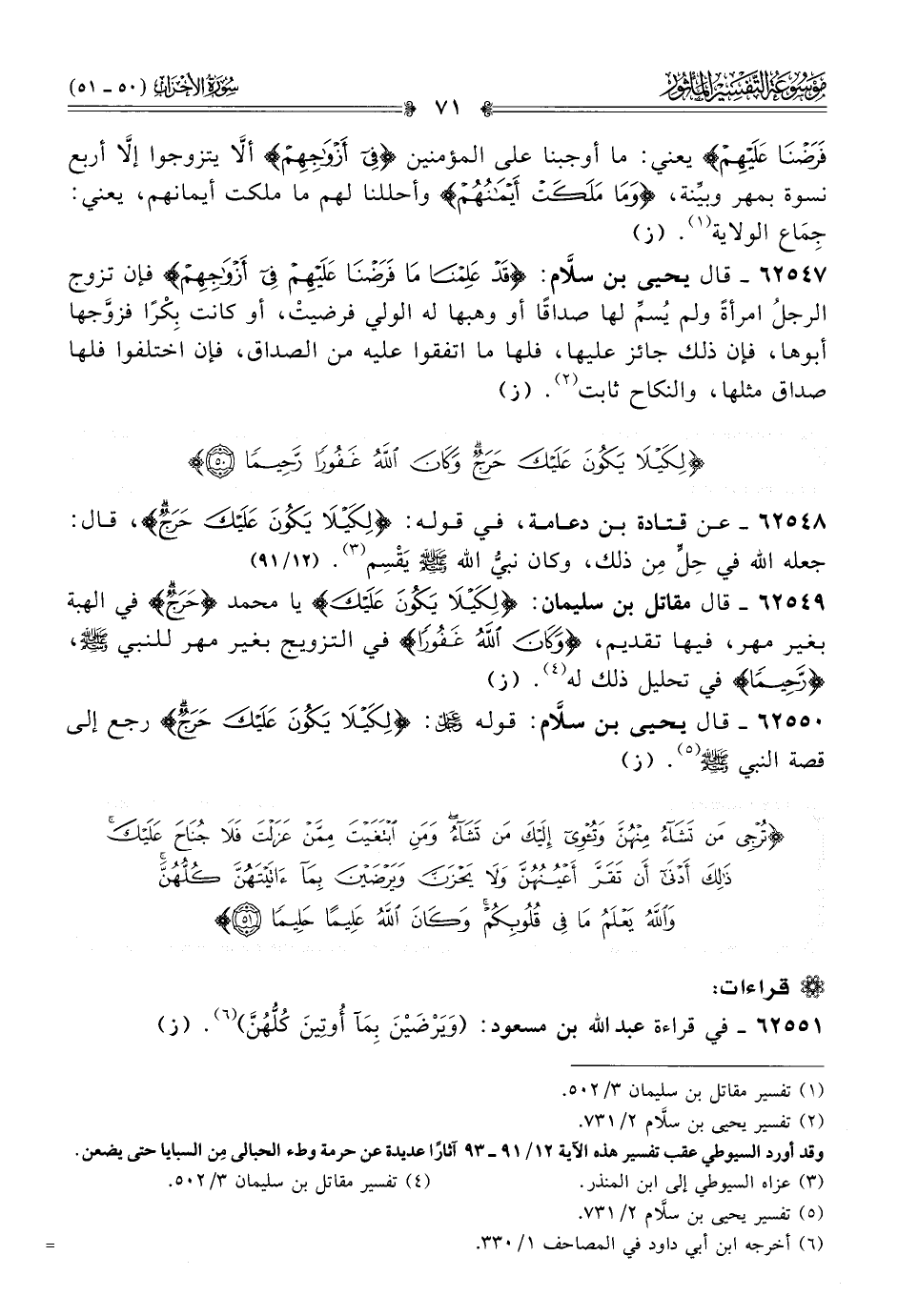 (¬٢) تفسير يحيى بن سلّام ٢/ ٧٣١.وقد أورد السيوطي عقب تفسير هذه الآية ١٢/ ٩١ - ٩٣ آثارًا عديدة عن حرمة وطء الحبالى مِن السبايا حتى يضعن.