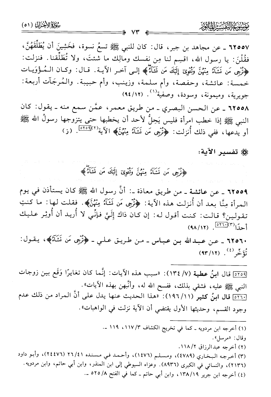 ٦٢٥٥٧ - عن مجاهد بن جبر، قال: كان للنبي - صلى الله عليه وسلم - تسعُ نسوة، فخَشِينَ أن يُطَلِّقَهُنَّ، فقُلْنَ: يا رسول الله، اقسِم لنا مِن نفسك ومالِك ما شئتَ، ولا تُطَلِّقنا. فنزلت: {تُرْجِي مَن تَشاءُ مِنهُنَّ وتُؤْوِي إلَيْكَ مَن تَشاءُ} إلى آخر الآية. قال: وكان المُؤْوَيات خمسة: عائشة، وحفصة، وأم سلمة، وزينب، وأم حبيبة. والمُرجَآت أربعة: جويرية، وميمونة، وسودة، وصفية (¬١). (١٢/ ٩٤)