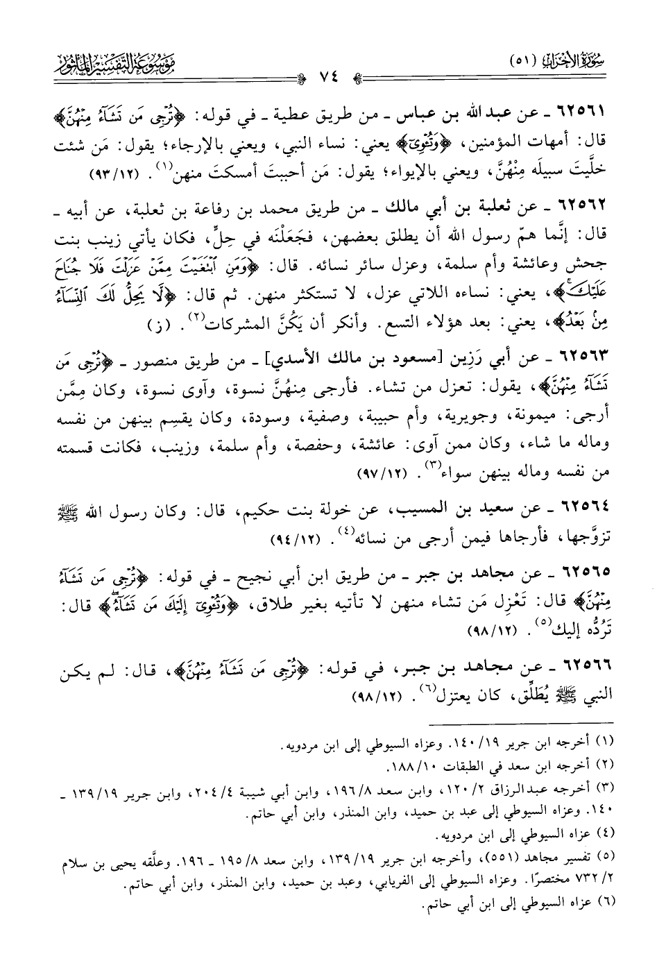 ٦٢٥٦٣ - عن أبي رَزِين [مسعود بن مالك الأسدي]-من طريق منصور- {تُرْجِي مَن تَشاءُ مِنهُنَّ}، يقول: تعزل من تشاء. فأرجى مِنهُنَّ نسوة، وآوى نسوة، وكان مِمَّن أرجى: ميمونة، وجويرية، وأم حبيبة، وصفية، وسودة، وكان يقسِم بينهن من نفسه وماله ما شاء، وكان ممن آوى: عائشة، وحفصة، وأم سلمة، وزينب، فكانت قسمته من نفسه وماله بينهن سواء (¬٣).
