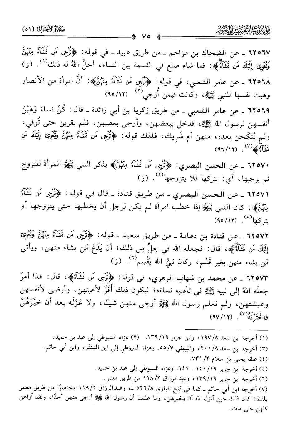 (¬٧) أخرجه ابن أبي حاتم -كما في فتح الباري ٨/ ٥٢٦ - ، وعبد الرزاق ٢/ ١١٨ مختصرًا من طريق معمر بلفظ: كان ذلك حين أنزل الله أن يخيرهن، وما علمنا أن رسول الله - صلى الله عليه وسلم - أرجى منهن أحدًا، ولقد آواهن كلهن حتى مات.