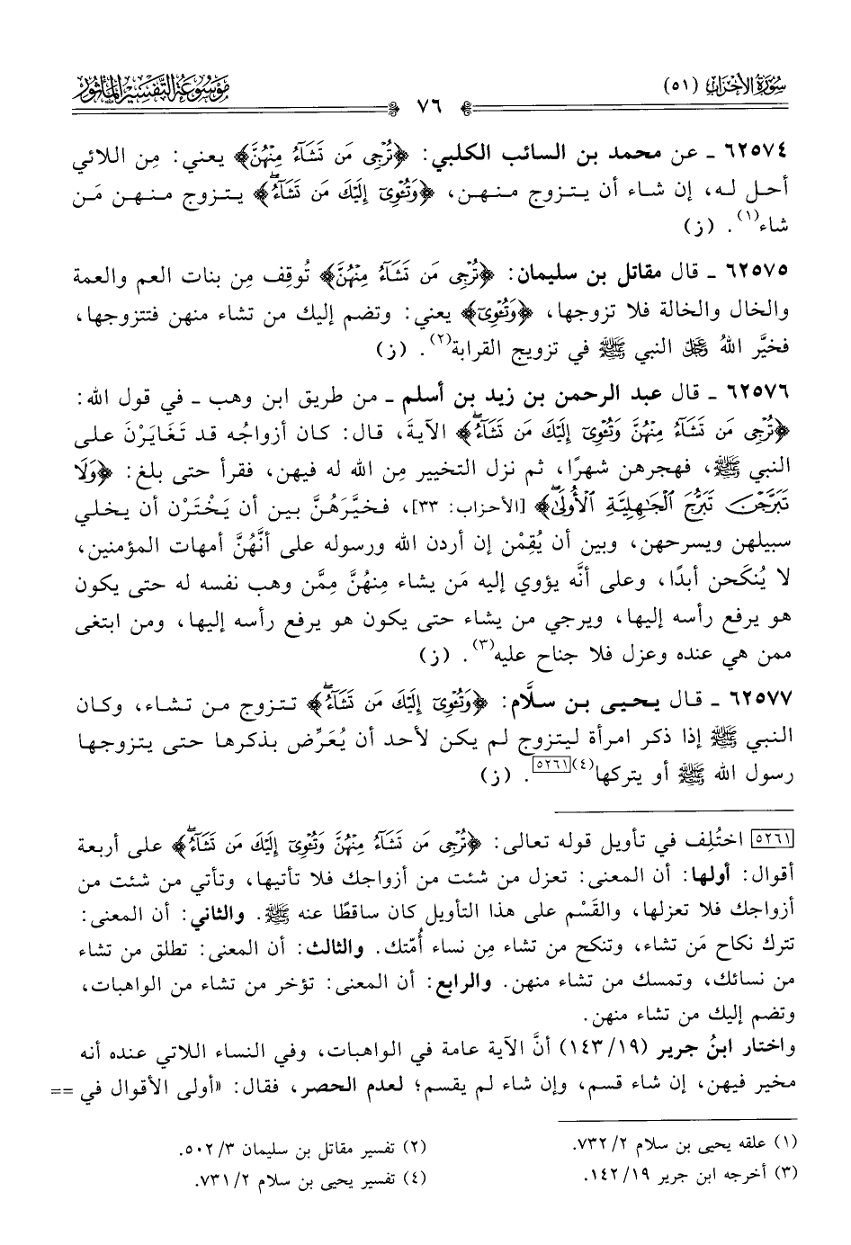 ومالَ ابنُ كثير (١١/ ١٩٦) إلى اختيار ابن جرير، مستندًا إلى السياق، فقال: «هذا الذي اختاره حسن جيّد قويّ، وفيه جمع بين الأحاديث، ولهذا قال تعالى: {ذَلِكَ أدْنى أنْ تَقَرَّ أعْيُنُهُنَّ ولا يَحْزَنَّ ويَرْضَيْنَ بِما آتَيْتَهُنَّ كُلُّهُنَّ} أي: إذا عَلِمْنَ أنّ الله قد وضع عنك الحرج في القسم، فإن شئت قسمت وإن شئت لم تقسم، لا جناح عليك في أي ذلك فعلت، ثم مع هذا أن تقسم لهنَّ اختيارًا منك، لا أنه على سبيل الوجوب، فَرِحْن بذلك واستبشرن به، وحملن جميلك في ذلك، واعْتَرَفْن بمِنَّتك عليهن في قسمتك لهن وتسويتك بينهن وإنصافك لهن وعدلك فيهن».