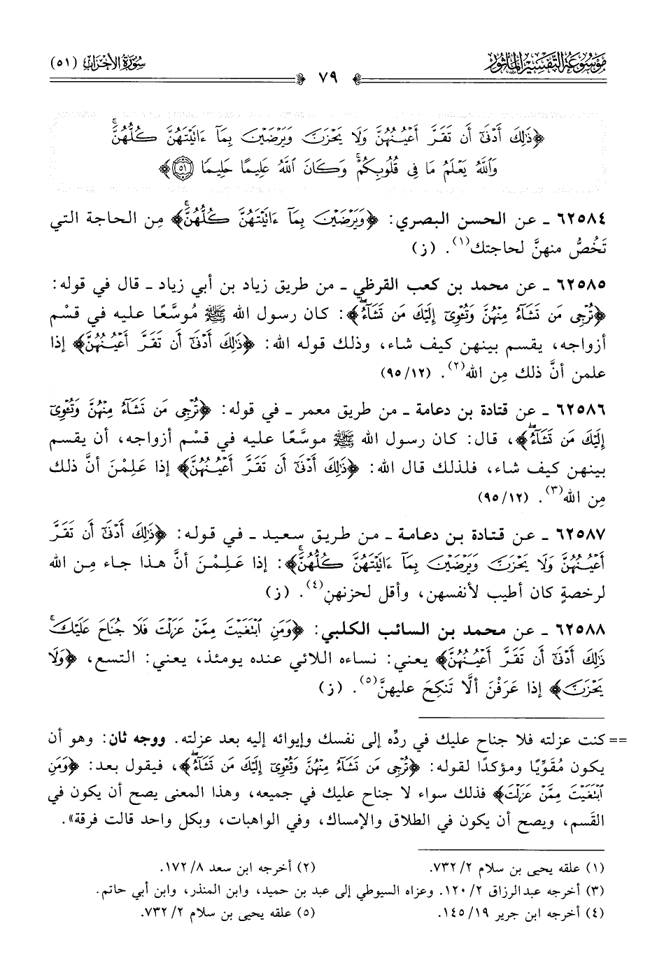 ٦٢٥٨٦ - عن قتادة بن دعامة -من طريق معمر- في قوله: {تُرْجِي مَن تَشاءُ مِنهُنَّ وتُؤْوِي إلَيْكَ مَن تَشاءُ}، قال: كان رسول الله - صلى الله عليه وسلم - موسَّعًا عليه في قسْم أزواجه، أن يقسم بينهن كيف شاء، فلذلك قال الله: {ذَلِكَ أدْنى أنْ تَقَرَّ أعْيُنُهُنَّ} إذا عَلِمْنَ أنّ ذلك مِن الله (¬٣). (١٢/ ٩٥)