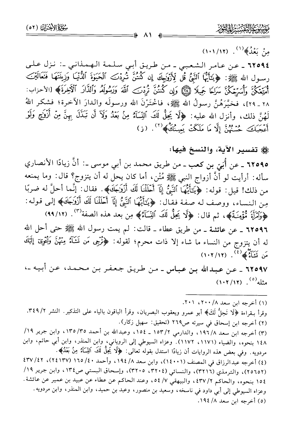 ٦٢٥٩٤ - عن عامر الشعبي -من طريق أبي سلمة الهمذاني-: نزل على رسول الله - صلى الله عليه وسلم -: {يا أيها النبي قل لأزواجك ان كنتن تردن الحياة والدنيا وزينتها فتعالين أمتعكن وأسرحكن سراحا جميلا * وإن كنتن تردن الله ورسوله والدار الآخرة} [الأحزاب: ٢٨ - ٢٩]، فخيَّرَهُنَّ رسولُ الله - صلى الله عليه وسلم -، فاخْتَرْنَ الله ورسولَه والدارَ الآخرة؛ فشكر اللهُ لَهُنَّ ذلك، وأنزل الله عليه: {لا يحل لك النساء من بعد ولا تبدل بهن من أزواج ولو أعجبك حسنهن إلا ما ملكت يمينك} (¬٢). (ز)
