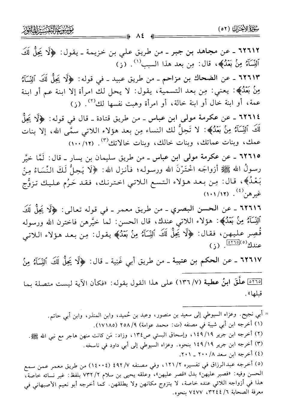 ٦٢٦١٦ - عن الحسن البصري -من طريق معمر- في قوله تعالى: {لا يَحِلُّ لَكَ النِّساءُ مِن بَعْدُ}: هؤلاء اللاتي عندك، قال الحسن: لما خيرَّهن فاخترن الله ورسوله قُصِر عليهن، فقال: {لا يَحِلُّ لَكَ النِّساءُ مِن بَعْدُ} يقول: مِن بعد هؤلاء اللاتي عندك (¬٥) [٥٢٦٥]. (ز)