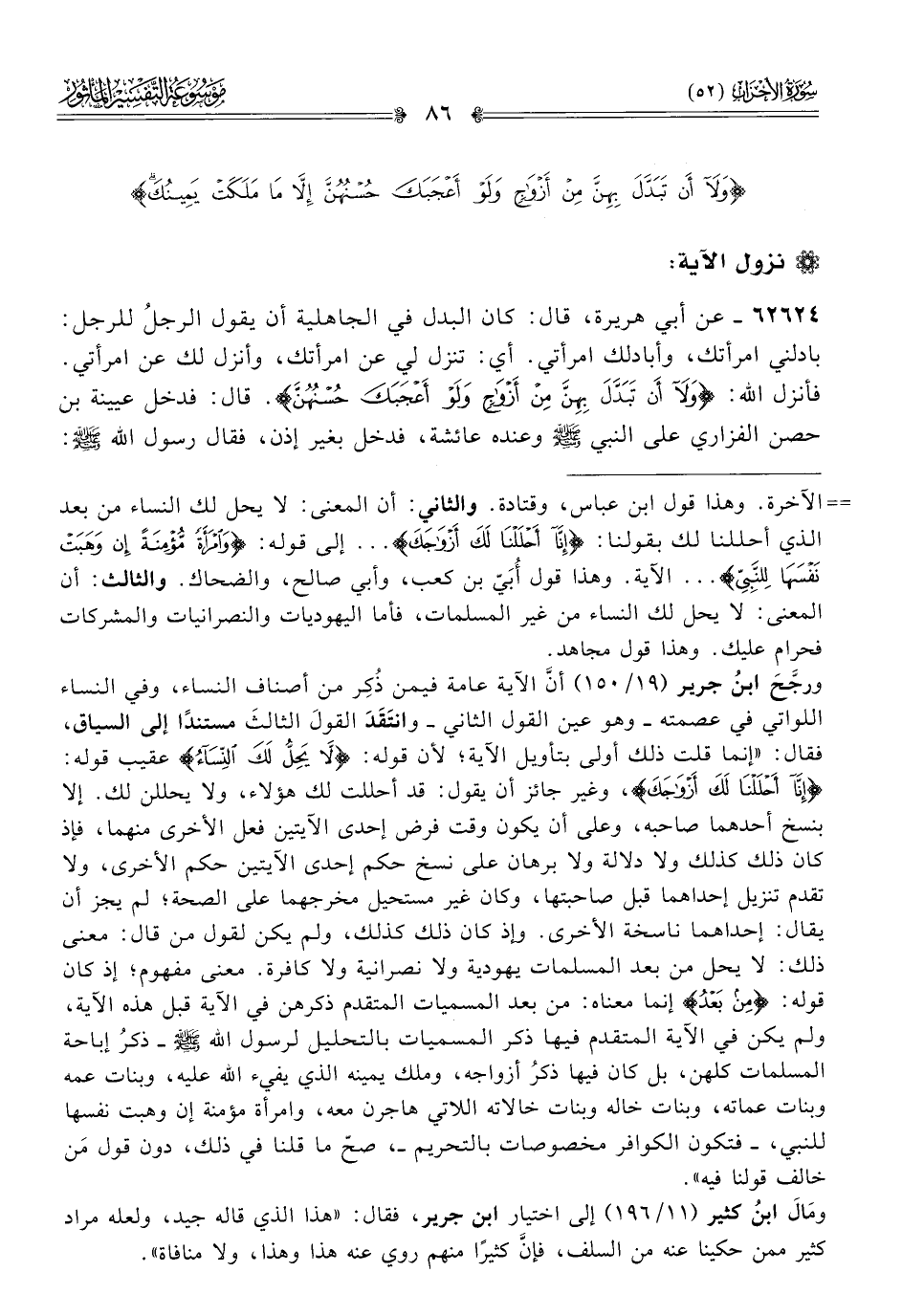 ٦٢٦٢٤ - عن أبي هريرة، قال: كان البدل في الجاهلية أن يقول الرجلُ للرجل: بادلني امرأتك، وأبادلك امرأتي. أي: تنزل لي عن امرأتك، وأنزل لك عن امرأتي. فأنزل الله: {ولا أنْ تَبَدَّلَ بِهِنَّ مِن أزْواجٍ ولَوْ أعْجَبَكَ حُسْنُهُنَّ}. قال: فدخل عيينة بن حصن الفزاري على النبي - صلى الله عليه وسلم - وعنده عائشة، فدخل بغير إذن، فقال رسول الله - صلى الله عليه وسلم -: