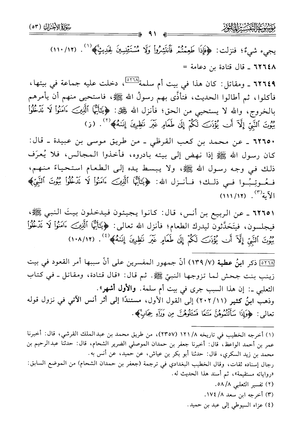 ٦٢٦٥٠ - عن محمد بن كعب القرظي -من طريق موسى بن عبيدة- قال: كان رسول الله - صلى الله عليه وسلم - إذا نهض إلى بيته بادروه، فأخذوا المجالس، فلا يُعرَف ذلك في وجه رسول الله - صلى الله عليه وسلم -، ولا يبسط يده إلى الطعام استحياءً منهم، فعُوتِبُوا في ذلك؛ فأنزل الله: {يا أيُّها الَّذِينَ آمَنُوا لا تَدْخُلُوا بُيُوتَ النبي} الآية (¬٣). (١٢/ ١١١)