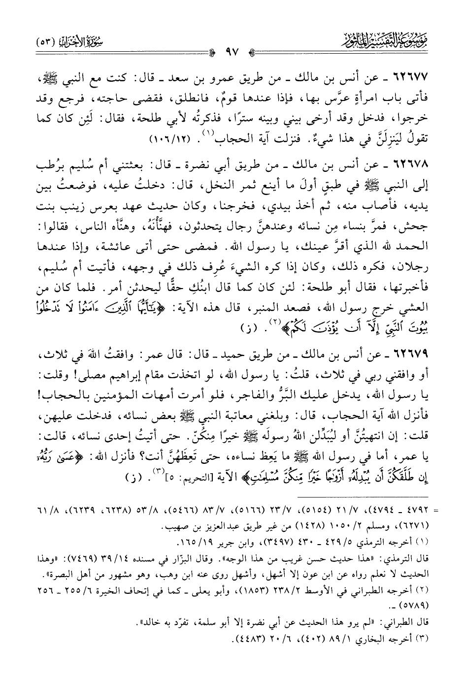 ٦٢٦٧٧ - عن أنس بن مالك -من طريق عمرو بن سعد- قال: كنت مع النبي - صلى الله عليه وسلم -، فأتى باب امرأةٍ عرَّس بها، فإذا عندها قومٌ، فانطلق، فقضى حاجته، فرجع وقد خرجوا، فدخل وقد أرخى بيني وبينه سترًا، فذكرتُه لأبي طلحة، فقال: لَئِن كان كما تقولُ ليَنزِلَنَّ في هذا شيءٌ. فنزلت آية الحجاب (¬١). (١٢/ ١٠٦)