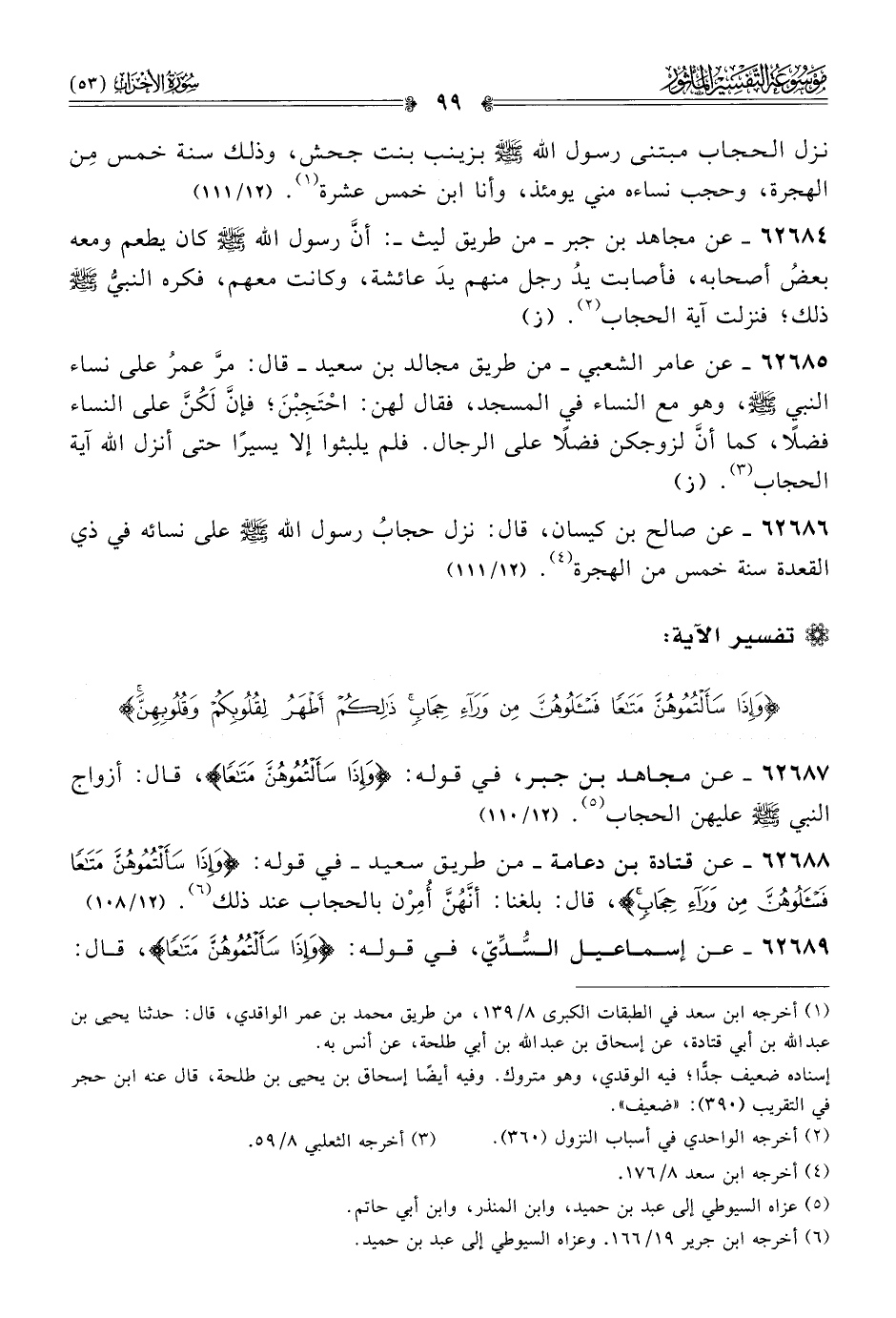 ٦٢٦٨٨ - عن قتادة بن دعامة -من طريق سعيد- في قوله: {وإذا سَأَلْتُمُوهُنَّ مَتاعًا فاسْأَلُوهُنَّ مِن وراءِ حِجابٍ}، قال: بلغنا: أنّهُنَّ أُمِرْن بالحجاب عند ذلك (¬٦). (١٢/ ١٠٨)