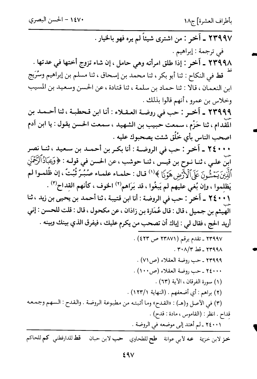 24001 - آخر (حب) : حب في الروضة: أنا ابن قتيبة، ثنا أحمد بن يحيى بن زيد، ثنا الهيثم بن جميل، قال: قال عُمَارة بن زاذان، عن مكحول، قال: قلت للحسن: إني أريد الحج، فقال لي: إياك أن تصحب من يكرم عليك، فيفرق الذي بينك وبينه.