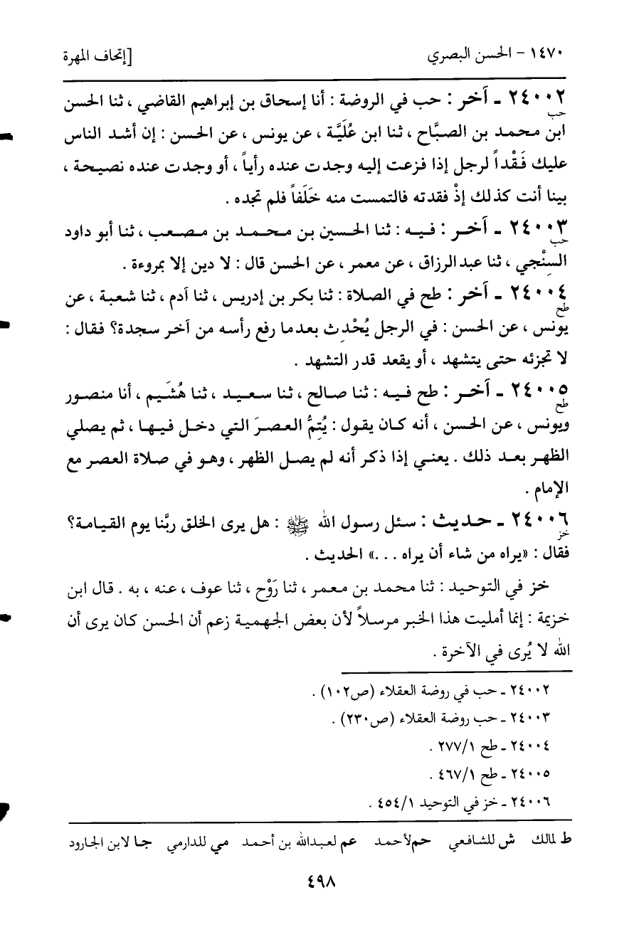 خز في التوحيد: ثنا محمد بن معمر، ثنا رَوْح، ثنا عوف، عنه، به. قال ابن خزيمة: إنما أمليت هذا الخبر مرسلاً لأن بعض الجهمية زعم أن الحسن كان يرى أن الله لا يُرى في الآخرة.