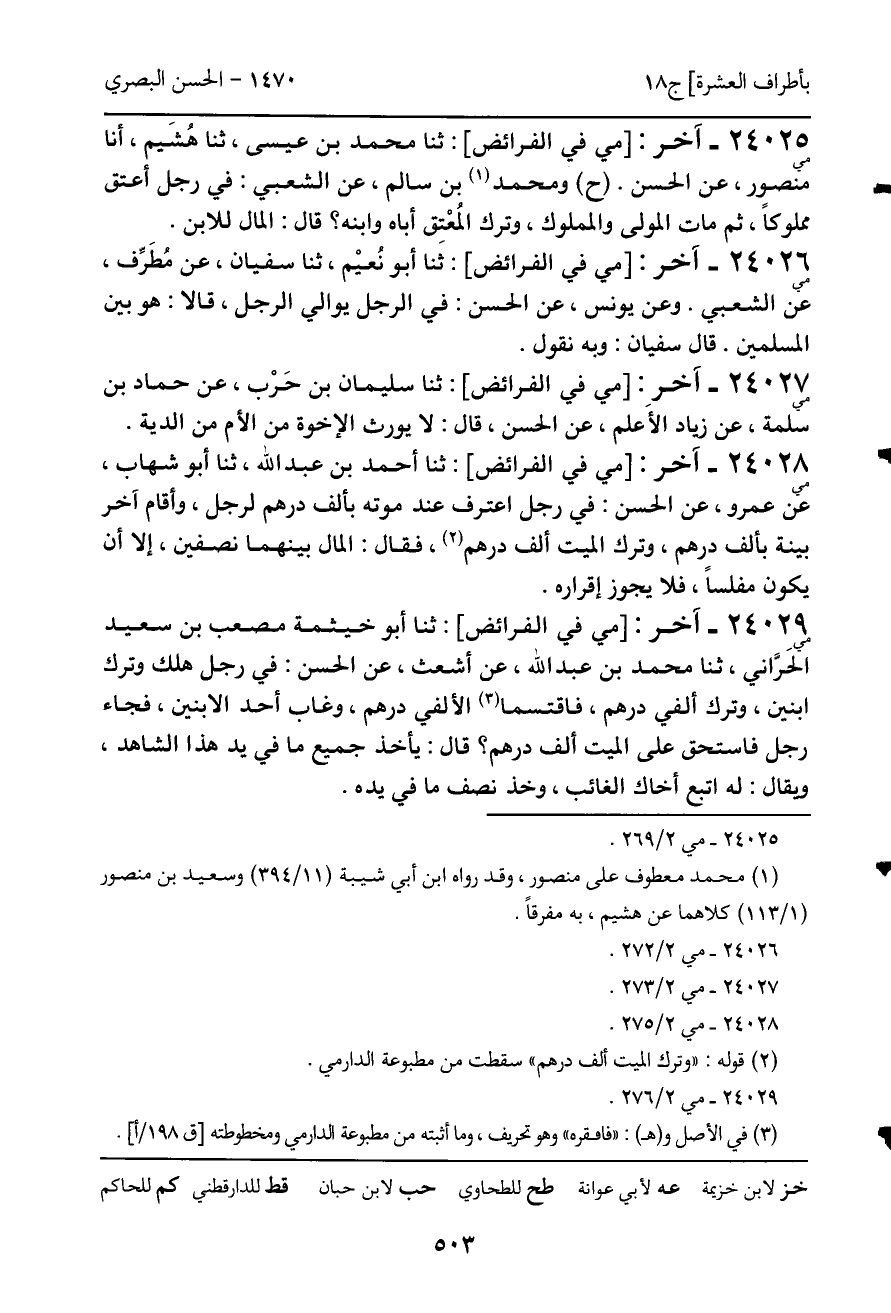 24029 - آخر (مي) : [مي في الفرائض] : ثنا أبو خيثمة مصعب بن سعيد الحَرَّاني، ثنا محمد بن عبد الله، عن أشعث، عن الحسن: في رجل هلك وترك ابنين، وترك ألفي درهم، فاقتسما الألفي درهم، وغاب أحد الابنين، فجاء رجل فاستحق على الميت ألف درهم؟ قال: يأخذ جميع ما في يد هذا الشاهد، ويقال: له اتبع أخاك الغائب، وخذ نصف ما في يده.
