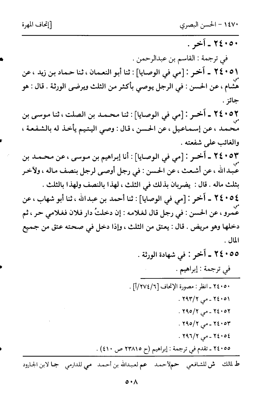 24053 - آخر (مي) : [مي في الوصايا] : أنا إبراهيم بن موسى، عن محمد بن عبد الله، عن أشعث، عن الحسن: في رجل أوصى لرجل بنصف ماله، ولآخر بثلث ماله. قال: يضربان بذلك في الثلث، لهذا بالنصف ولهذا بالثلث.