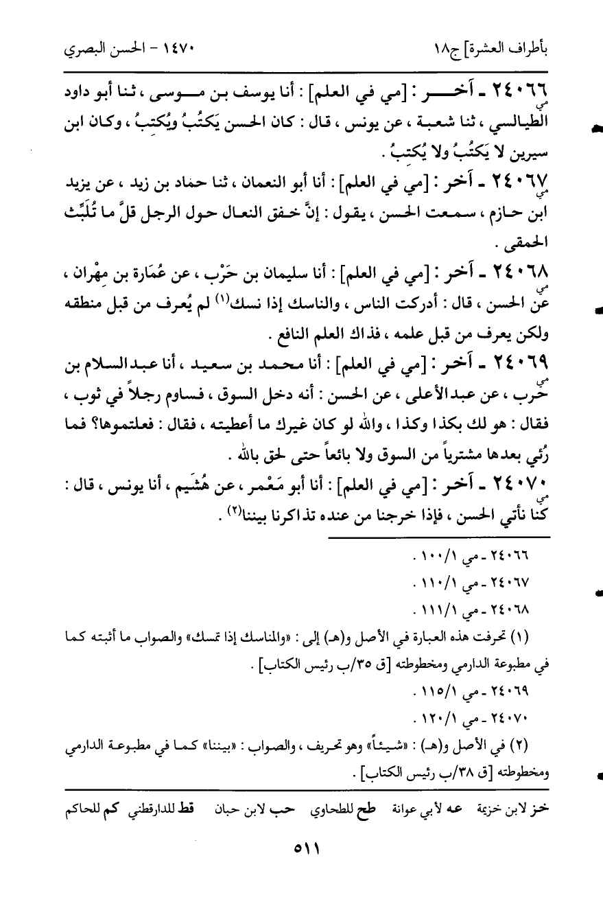 24066 - آخر (مي) : [مي في العلم] : أنا يوسف بن موسى، ثنا أبو داود الطيالسي، ثنا شعبة، عن يونس، قال: كان الحسن يَكتبُ ويكتِبُ، وكان ابن سيرين لا يَكتُب ولا يُكتِب.
