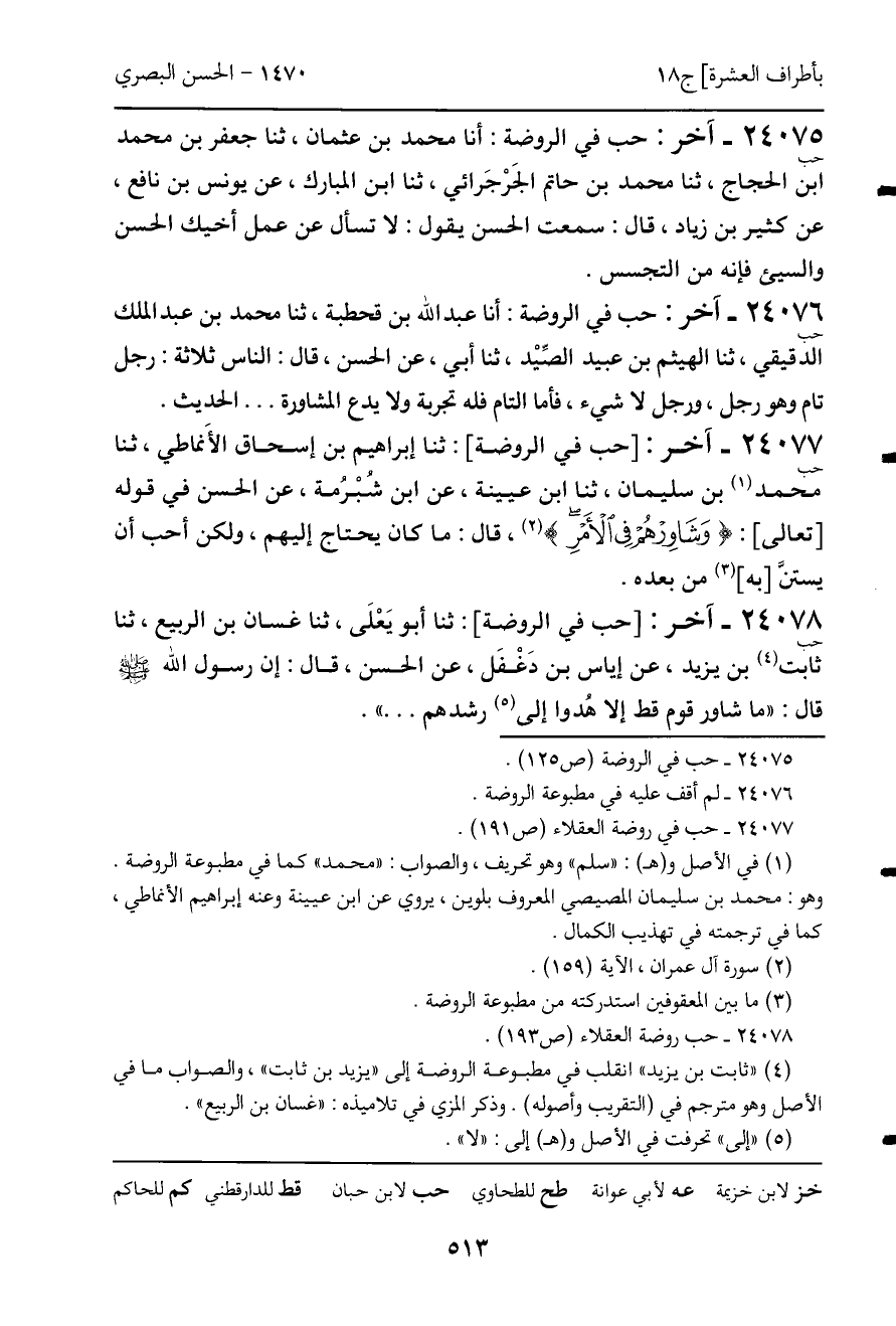 24075 - آخر (حب) : حب في الروضة: أنا محمد بن عثمان، ثنا جعفر بن محمد ابن الحجاج، ثنا محمد بن حاتم الجَرْجَرائي، ثنا ابن المبارك، عن يونس بن نافع، عن كثير بن زياد، قال: سمعت الحسن يقول: لا تسأل عن عمل أخيك الحسن والسيئ فإنه من التجسس.