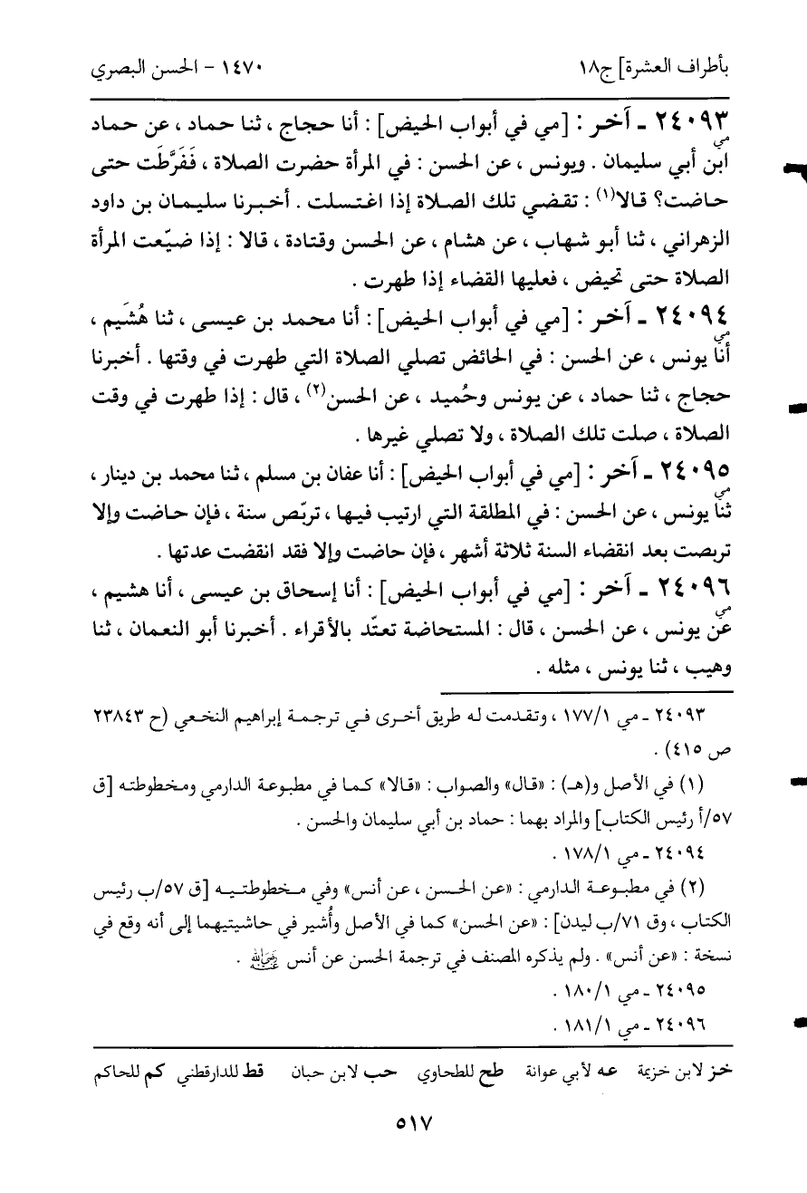 24096 - آخر (مي) : [مي في أبواب الحيض] : أنا إسحاق بن عيسى، أنا هشيم، عن يونس، عن الحسن، قال: المستحاضة تعتّد بالأقراء. أخبرنا أبو النعمان، ثنا وهيب، ثنا يونس، مثله.