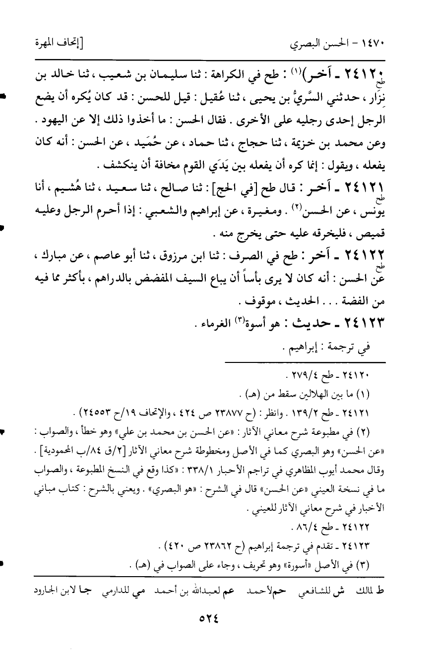 24122 - آخر (طح) : طح في الصرف: ثنا ابن مرزوق، ثنا أبو عاصم، عن مبارك، عن الحسن: أنه كان لا يرى بأساً أن يباع السيف المفضض بالدراهم، بأكثر مما فيه من الفضة ... الحديث، موقوف.