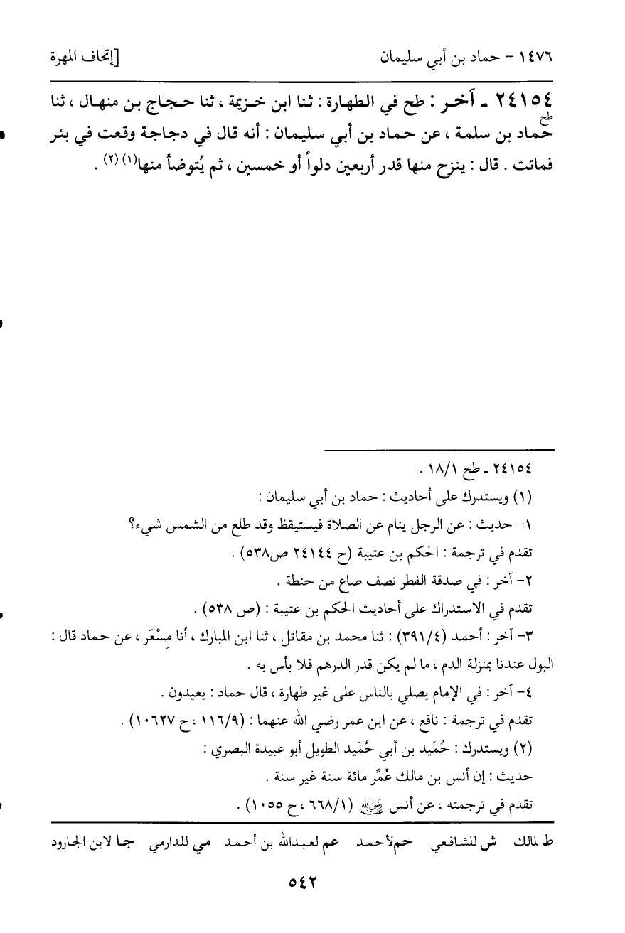 24154 - آخر (طح) : طح في الطهارة: ثنا ابن خزيمة، ثنا حجاج بن منهال، ثنا حماد بن سلمة، عن حماد بن أبي سليمان: أنه قال في دجاجة وقعت في بئر فماتت. قال: ينزح منها قدر أربعين دلواً أو خمسين، ثم يُتوضأ منها.