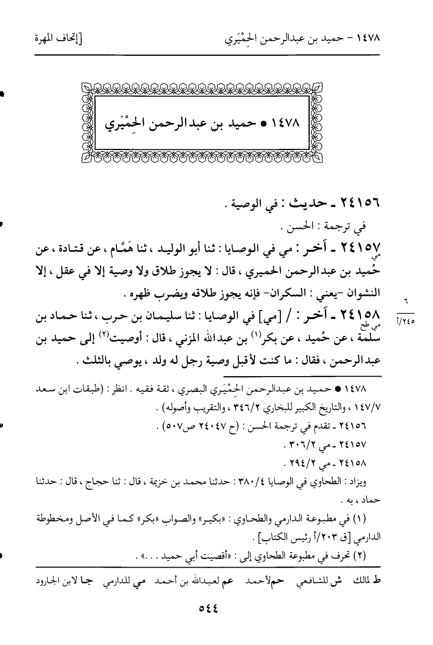 24158 - آخر (مي طح) : [مي] في الوصايا: ثنا سليمان بن حرب، ثنا حماد بن سلمة، عن حُميد، عن بكر بن عبد الله المزني، قال: أوصيت إلى حميد بن عبد الرحمن، فقال: ما كنت لأقبل وصية رجل له ولد، يوصي بالثلث.