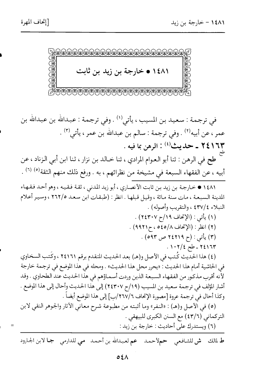 طح في الرهن. ثنا أبو العوام المرادي، ثنا خالد بن نزار، ثنا ابن أبي الزناد، عن أبيه، عن الفقهاء السبعة في مشيخة من نظرائهم، به ورفع ذلك منهم الثقة.