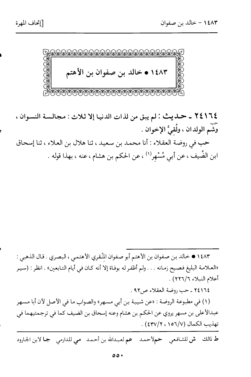 حب في روضة العقلاء: أنا محمد بن سعيد، ثنا هلال بن العلاء، ثنا إسحاق ابن الضَّيف، عن أبي مسْهِر، عن الحكم بن هشام، عنه، بهذا قوله.