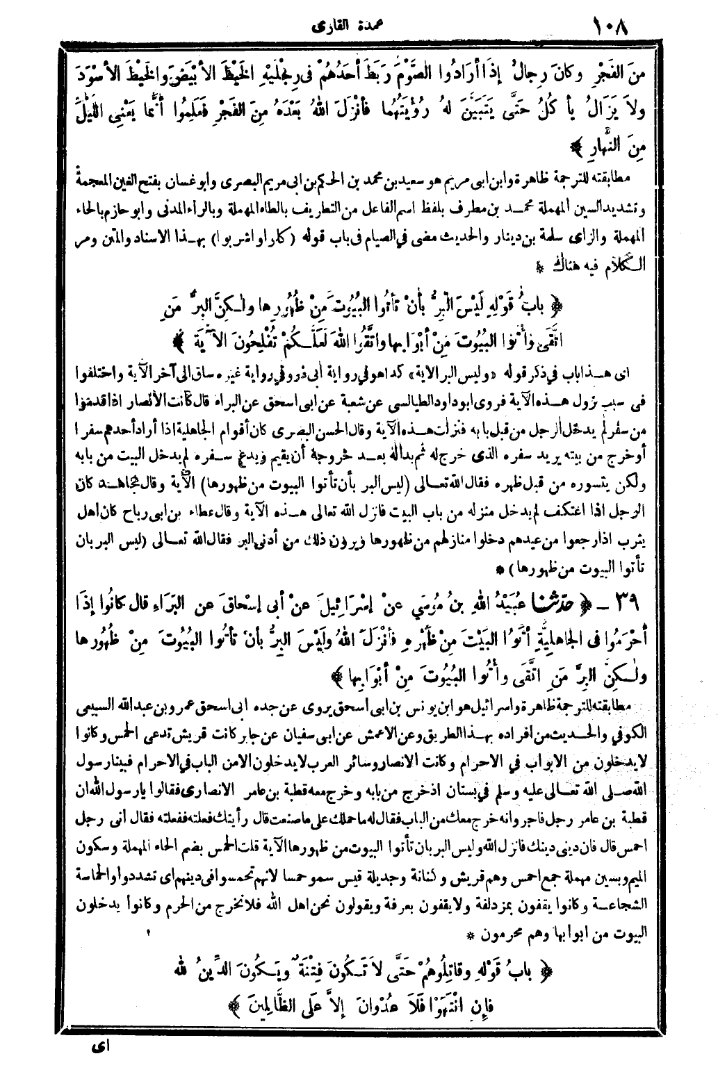 أَي: هَذَا بَاب فِي ذكر قَوْله: (وَلَيْسَ الْبر) الْآيَة كَذَا هُوَ فِي رِوَايَة أبي ذَر، وَفِي رِوَايَة غَيره سَاق إِلَى آخر الْآيَة، وَاخْتلفُوا فِي سَبَب نزُول هَذِه الْآيَة. فروى أَبُو دَاوُد الطَّيَالِسِيّ عَن شُعْبَة عَن أبي إِسْحَاق عَن الْبَراء، قَالَ: كَانَت الْأَنْصَار إِذا قدمُوا من سفر لم يدْخل الرجل من قبل بَابه، فَنزلت هَذِه الْآيَة وَقَالَ الْحسن الْبَصْرِيّ: كَانَ أَقوام الْجَاهِلِيَّة إِذا أَرَادَ أحدهم سفرا أَو خرج من بَيته يُرِيد سَفَره الَّذِي خرج لَهُ ثمَّ بدا لَهُ بعد خُرُوجه أَن يُقيم ويدع سَفَره لم يدْخل الْبَيْت من بَابه وَلَكِن يتسوره من قبل ظَهره. فَقَالَ الله تَعَالَى: {لَيْسَ الْبر بِأَن تَأْتُوا الْبيُوت من ظُهُورهَا} (الْبَقَرَة: 189) الْآيَة. وَقَالَ مُجَاهِد: كَانَ الرجل إِذا اعْتكف لم يدْخل من بَاب الْبَيْت فَأنْزل الله تَعَالَى هَذِه الْآيَة وَقَالَ عَطاء بن أبي رَبَاح: كَانَ أهل يثرب إِذا رجعُوا من عيدهم دخلُوا مَنَازِلهمْ من ظُهُورهَا، ويرون ذَلِك من أدنى الْبر فَقَالَ الله تَعَالَى: {لَيْسَ البربان تَأْتُوا الْبيُوت من ظُهُورهَا} (الْبَقَرَة: 189) .