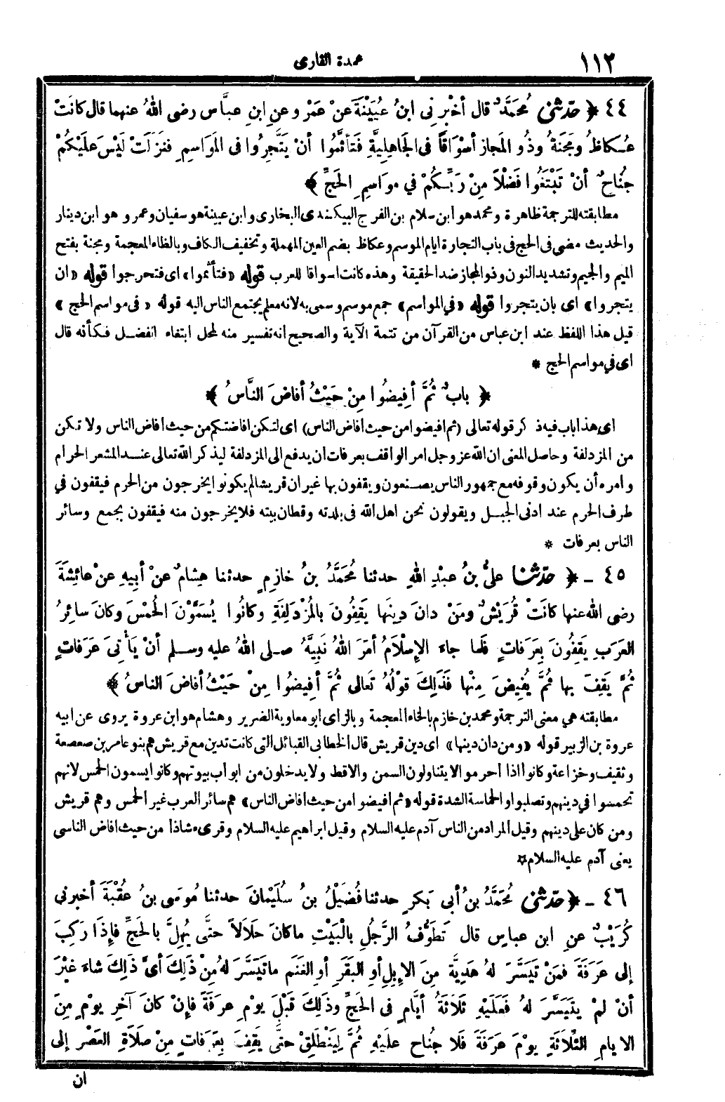 أَي: هَذَا بَاب فِيهِ ذكر قَوْله تَعَالَى: {ثمَّ أفيضوا من حَيْثُ أَفَاضَ النَّاس} أَي: لتكن إفاضتكم من حَيْثُ أَفَاضَ النَّاس وَلَا تكن من الْمزْدَلِفَة، وَحَاصِل الْمَعْنى: أَن الله عز وَجل، أَمر الْوَاقِف بِعَرَفَات أَن يدْفع إِلَى الْمزْدَلِفَة ليذكر الله تَعَالَى عِنْد الْمشعر الْحَرَام وَأمره أَن يكون وُقُوفه مَعَ جُمْهُور النَّاس يصنعون ويقفون بهَا. غير أَن قُريْشًا لم يَكُونُوا يخرجُون من الْحرم، فيقفون فِي طرف الْحرم عِنْد أدنى الْجَبَل وَيَقُولُونَ: نَحن أهل الله فِي بلدته وقطان بَيته، فَلَا يخرجُون مِنْهُ فيقفون بِجمع وَسَائِر النَّاس بِعَرَفَات.