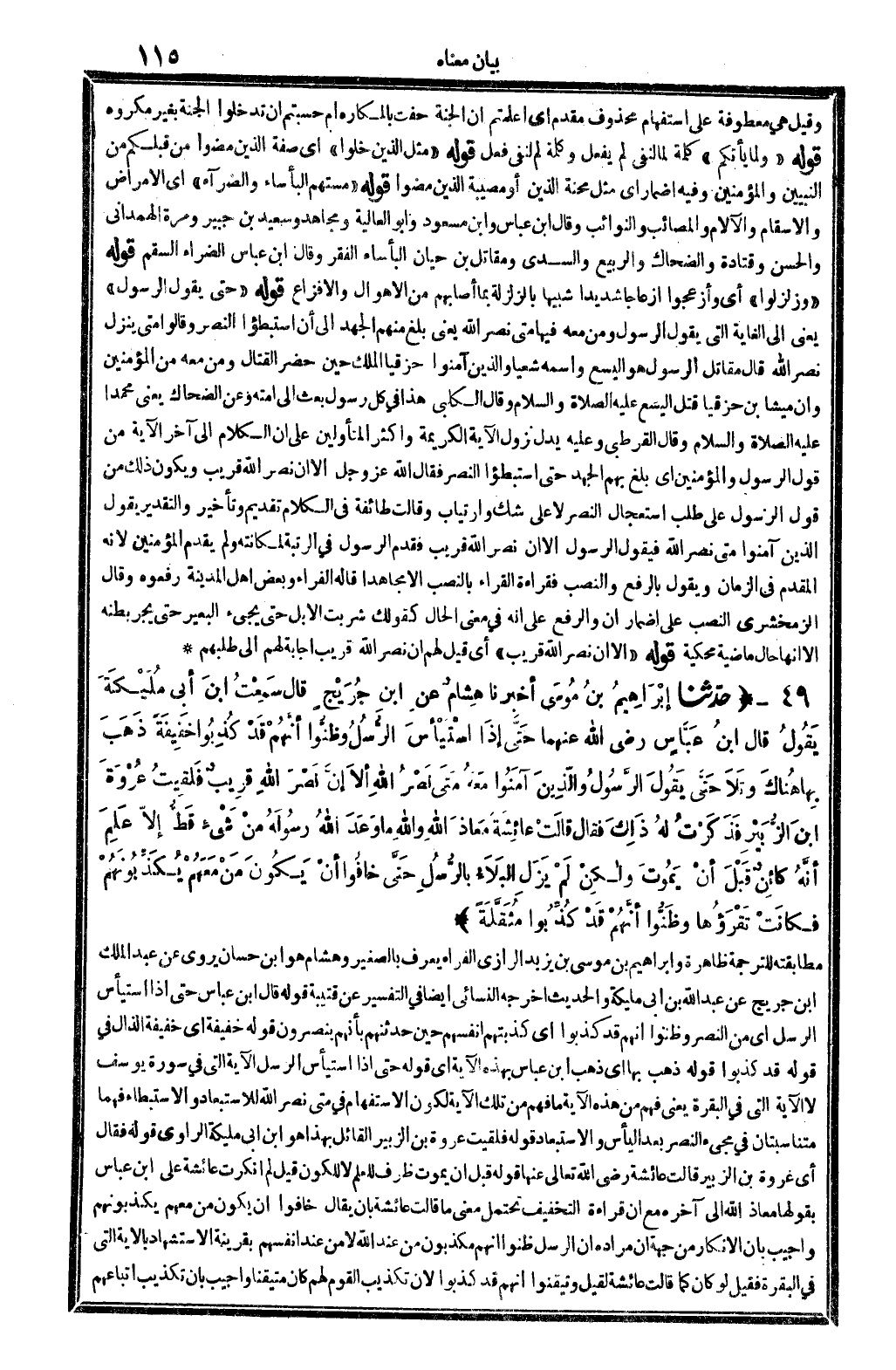 4524 - ح دَّثنا إبْرَاهِيمُ بنُ مُوسَى أخبرنَا هِشامٌ عنِ ابنِ جُرَيْجٍ قَالَ سَمِعْتُ ابنَ أبِي مُلَيْكَةَ يَقُولُ قَالَ ابنُ عَبَّاسٍ رَضِيَ الله عَنْهُمَا حَتَّى إذَا استَيْأسَ الرُّسُلُ وَظَنُّوا أنَّهُمْ قَدْ كُذِبُوا خَفِيفَةَ ذَهَبَ بِها هُنَاكَ وَتَلا {حَتَّى يَقُولَ الرَّسُولَ وَالَّذِينَ آمَنُوا مَعَهُ مَتَى نَصْرُ الله قَرِيبٌ} (الْبَقَرَة: 141) فَلقِيتُ عُرْوَةَ ابنَ الزُّبَيْرِ فَذَكَرْتُ لَهُ ذَلِكَ فَقَالَ قَالَتْ عَائِشَةَ مَعَاذَ الله وَالله مَا وَعَدَ الله رَسُولَهُ مِنْ شَيْءٍ قَطُّ إلاّ عَلِمَ أنَّهُ كَائِنٌ قَبْلَ أنْ يَمُوتَ وَلاكِنْ لَمْ يَزَل البَلاءُ بَالرُّسُلِ حَتَّى خَافُوا أنْ يَكُونَ من مَعَهُمْ يُكَذِّبُونَهُمْ فَكَانَتْ تَقّرَؤُها وَظَنُّوا أنَّهُمْ قَدْ كُذِّبُوا مُثَقَّلَةً.