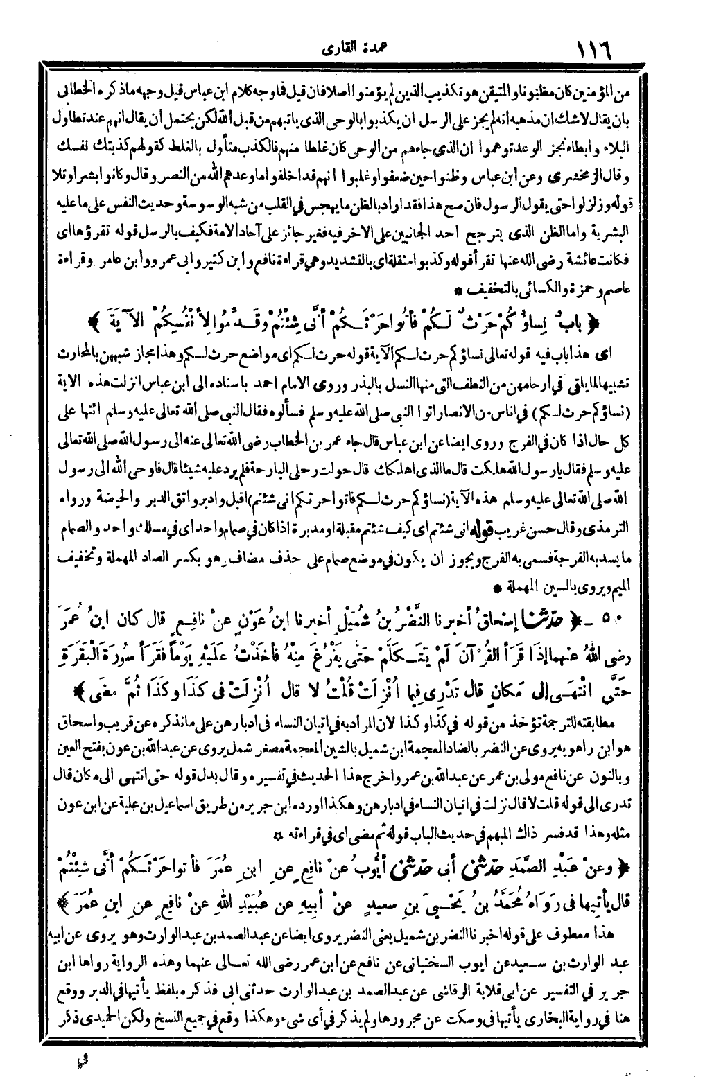 أَي: هَذَا بَاب فِيهِ قَوْله تَعَالَى: {نِسَاؤُكُمْ حرث لكم} الْآيَة قَوْله: {حرث لكم} أَي: مَوَاضِع حرث لكم، وَهَذَا مجَاز شبههن بالمحارث تَشْبِيها لما يلقى فِي أرحامهن من النطف الَّتِي مِنْهَا النَّسْل بالبذر، وروى الإِمَام أَحْمد بِإِسْنَادِهِ إِلَى ابْن عَبَّاس أنزلت هَذِه الْآيَة {نِسَاؤُكُمْ حرث لكم} فِي أنَاس من الْأَنْصَار أَتَوا النَّبِي صلى الله عَلَيْهِ وَسلم، فَسَأَلُوهُ. فَقَالَ النَّبِي صلى الله عَلَيْهِ وَسلم: ائتها على كل حَال إِذا كَانَ فِي الْفرج، وَرُوِيَ أَيْضا عَن ابْن عَبَّاس، قَالَ: جَاءَ عمر بن الْخطاب رَضِي الله تَعَالَى عَنهُ إِلَى رَسُول الله صلى الله عَلَيْهِ وَسلم. فَقَالَ: يَا رَسُول الله {هَلَكت} قَالَ: مَا الَّذِي أهْلكك؟ قَالَ: حولت رحلي البارحة فَلم يرد عَلَيْهِ شَيْئا. قَالَ: فَأوحى الله إِلَى رَسُول الله صلى الله عَلَيْهِ وَسلم هَذِه الْآيَة: {نِسَاؤُكُمْ حرث لكم فَأتوا حَرْثكُمْ أَنى شِئْتُم} أقبل وَأدبر وَاتَّقِ الدبر والحيضة، وَرَوَاهُ التِّرْمِذِيّ، وَقَالَ: حسن غَرِيب. قَوْله: (أنَّى شِئْتُم) ، أَي: كَيفَ شِئْتُم مقبلة أَو مُدبرَة إِذا كَانَ فِي صمام وَاحِد. أَي: فِي مَسْلَك وَاحِد، والصمام مَا يسد بِهِ الفرجة فَسمى بِهِ الْفرج وَيجوز أَن يكون فِي مَوضِع صمام على حذف مُضَاف، وَهُوَ بِكَسْر الصَّاد الْمُهْملَة وتحفيف الْمِيم، ويروى بِالسِّين الْمُهْملَة.