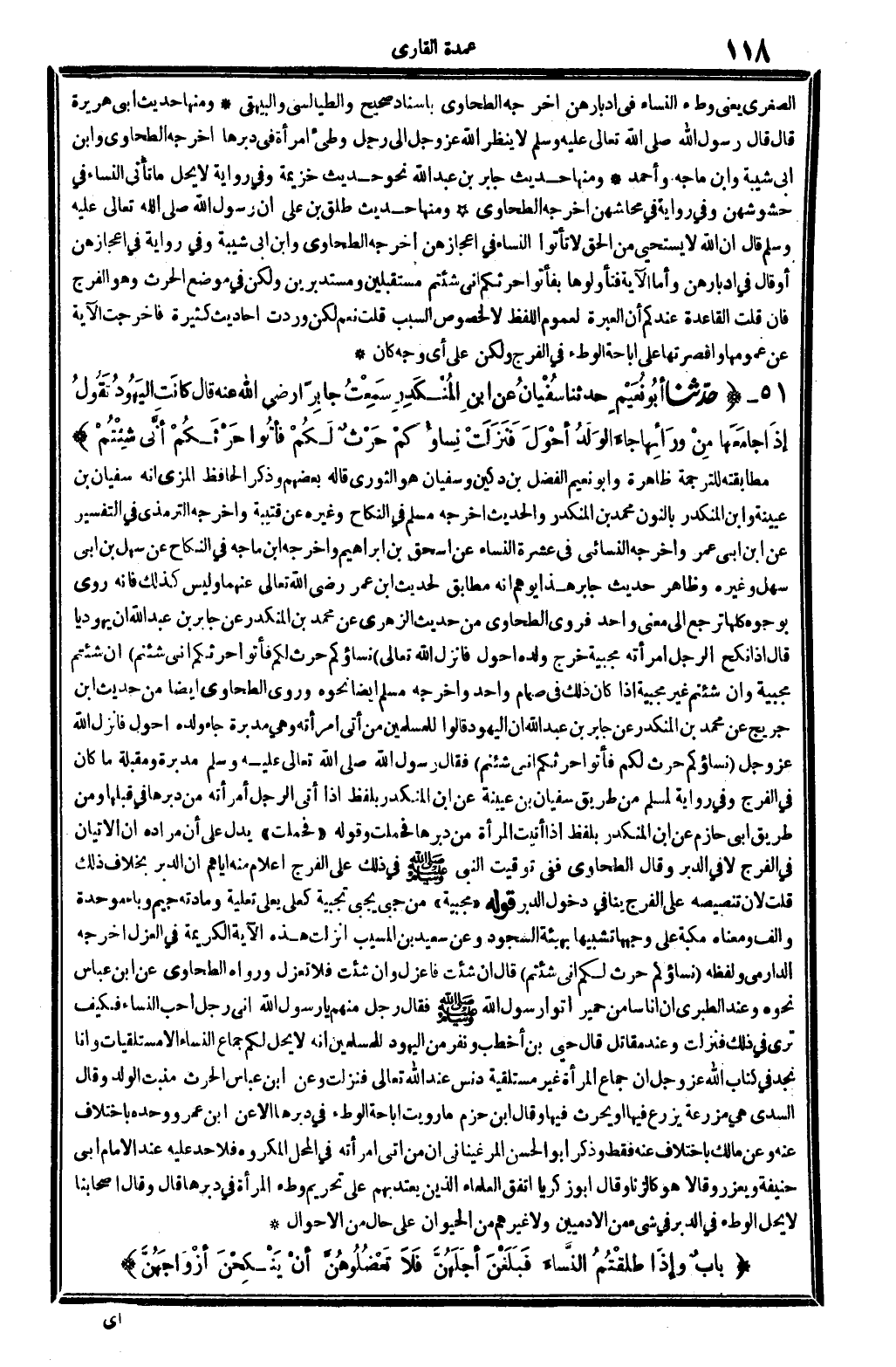 وَظَاهر حَدِيث جَابر هَذَا يُوهم أَنه مُطَابق لحَدِيث ابْن عمر، رَضِي الله تَعَالَى عَنْهُمَا، وَلَيْسَ كَذَلِك فَإِنَّهُ روى بِوُجُوه كلهَا ترجع إِلَى معنى وَاحِد، فروى الطَّحَاوِيّ من حَدِيث الزُّهْرِيّ عَن مُحَمَّد بن الْمُنْكَدر عَن جَابر بن عبد الله أَن يَهُودِيّا قَالَ: إِذا نكح الرجل امْرَأَته مجبية خرج وَلَده أَحول فَأنْزل الله تَعَالَى: {نِسَاؤُكُمْ حرث لكم فَأتوا حَرْثكُمْ أَنى شِئْتُم} إِن شِئْتُم مجبية، وَإِن شِئْتُم غير مجببة إِذا كَانَ ذَلِك فِي صمام وَاحِد. وَأخرجه مُسلم أَيْضا نَحوه: وروى الطَّحَاوِيّ أَيْضا من حَدِيث ابْن جريج عَن مُحَمَّد بن الْمُنْكَدر عَن جَابر بن عبد الله أَن الْيَهُود قَالُوا للْمُسلمين: من أَتَى امْرَأَته وَهِي مُدبرَة جَاءَ وَلَده أَحول، فَأنْزل الله عز وَجل: {نِسَاؤُكُمْ حرث لكم فَأتوا حَرْثكُمْ أَنى شِئْتُم} فَقَالَ رَسُول الله صلى الله عَلَيْهِ وَسلم: مُدبرَة ومقبلة مَا كَانَ فِي الْفرج، وَفِي رِوَايَة لمُسلم من طَرِيق سُفْيَان بن عُيَيْنَة عَن ابْن الْمُنْكَدر، بِلَفْظ: إِذا أَتَى الرجل امْرَأَته من دبرهَا فِي قبلهَا، وَمن طَرِيق أبي حَازِم عَن ابْن الْمُنْكَدر بِلَفْظ: إِذا أتيت الْمَرْأَة من دبرهَا فَحملت. وَقَوله: (فَحملت) يدل على أَن مُرَاده أَن الْإِتْيَان فِي الْفرج لَا فِي الدبر. وَقَالَ الطَّحَاوِيّ: فَفِي تَوْقِيت النَّبِي صلى الله عَلَيْهِ وَسلم فِي ذَلِك على الْفرج إِعْلَام مِنْهُ إيَّاهُم أَن الدبر بِخِلَاف ذَلِك. قلت: لِأَن تنصيصه على الْفرج يُنَافِي دُخُول الدبر قَوْله: (مجبية) من جبى يجبى تجبية، كعلى يعلى تعلية، ومادته جِيم وياء مُوَحدَة وَألف، وَمَعْنَاهُ: مَكِّيَّة على وَجههَا تَشْبِيها بهيئة السُّجُود، وَعَن سعيد بن الْمسيب: أنزلت هَذِه الْآيَة الْكَرِيمَة فِي الْغَزل، أخرجه الدَّارمِيّ وَلَفظه (نِسَاؤُكُمْ حرث لكم أَنى شِئْتُم) ، قَالَ: إِن شِئْت فاعزل وَإِن شِئْت فَلَا تعزل، وَرَوَاهُ الطَّحَاوِيّ عَن ابْن عَبَّاس نَحوه: وَعند الطَّبَرِيّ: أَن أُنَاسًا من حمير أَتَوا رَسُول الله صلى الله عَلَيْهِ وَسلم فَقَالَ رجل مِنْهُم: يَا رَسُول الله: إِنِّي رجل أحب النِّسَاء، فَكيف ترى فِي ذَلِك؟ فَنزلت: وَعِنْده مقَاتل، قَالَ: حييّ بن أَخطب وَنَفر من الْيَهُود للْمُسلمين إِنَّه لَا يحل لكم جماع النِّسَاء إِلَّا مستلقيات، وَإِنَّا نجد فِي كتاب الله عز وَجل أَن جماع الْمَرْأَة غير مستلقية دنس عِنْد الله تَعَالَى، فَنزلت: وَعَن ابْن عَبَّاس الْحَرْث منبت الْوَلَد، وَقَالَ السّديّ: هِيَ مزرعة يَزع فِيهَا أَو يحرث فِيهَا، وَقَالَ ابْن حزم: مَا رويت إِبَاحَة الْوَطْء فِي دبرهَا إلاّ عَن ابْن عَمْرو وَحده باخْتلَاف عَنهُ، وَعَن مَالك باخْتلَاف عَنهُ فَقَط، وَذكر أَبُو الْحسن المرغيناني، أَن من أَتَى امْرَأَته فِي الْمحل الْمَكْرُوه فَلَا حد عَلَيْهِ عِنْد الإِمَام أبي حنيفَة وَيُعَزر، وَقَالَ هُوَ كَالزِّنَا، وَقَالَ أَبُو زَكَرِيَّا اتّفق الْعلمَاء الَّذين يعْتد بهم على تَحْرِيم وَطْء الْمَرْأَة فِي دبرهَا قَالَ: وَقَالَ أَصْحَابنَا: لَا يحل الْوَطْء فِي الدبر فِي شَيْء من الْآدَمِيّين وَلَا غَيرهم من الْحَيَوَان على حَال من الْأَحْوَال.