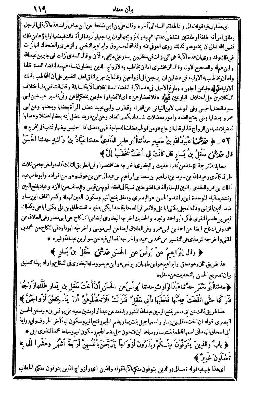 حدَّثنا أبُو مَعْمَرٍ حدَّثنا عَبْدُ الوَارِثِ حدَّثنا يُونُس عنِ الحَسَنِ أنَّ أُخْتَ مَعْقِلٍ بنِ يَسَارٍ طَلَقَهَا زَوْجُها فَتَرَكَها حَتَّى انْقَضَتْ عِدَّتُها فَخَطَبَها فَأَبَى مَعْقِلٌ فَنَزَلَتْ {فَلا تَعْضُلوهُنَّ أنْ يَنْكِحْنَ أزْوَاجَهُنَّ} .