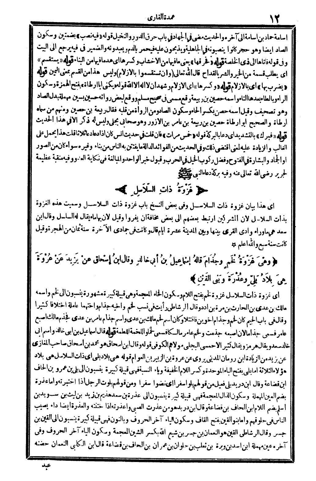 أَي: غَزْوَة ذَات السلَاسِل غَزْوَة لخم، بِفَتْح اللَّام وَسُكُون الْخَاء الْمُعْجَمَة: وَهِي قَبيلَة كَبِيرَة مَشْهُورَة ينسبون إِلَى لخم واسْمه مَالك بن عدي بن الْحَارِث بن مرّة بن أدد، وَقَالَ الرشاطي: رَأَيْت فِي نسب لخم وأخيه جذام وأختهما عاملة اخْتِلَافا كثيرا، وَقَالَ فِي بَاب الْجِيم: كَانَ لخم وجذام أَخَوَيْنِ فاقتتلا، وكا اسْم لخم مَالك بن عدي، وَاسم جذام عَامر بن عدي فجذم مَالك إِصْبَع عَامر فَسُمي جذاماً، لِأَن أُصْبُعه جذمت، ولخم عَامر مَالِكًا فَسمى لخماً، واللخمة اللَّطْمَة. قَوْله: (قَالَ إِسْمَاعِيل بن أبي خَالِد) وَاسم أبي خَالِد: سعد، وَيُقَال: هُرْمُز، وَيُقَال: كثير الأحمسي البَجلِيّ مَوْلَاهُم الْكُوفِي. قَوْله: (وَقَالَ ابْن إِسْحَاق) هُوَ مُحَمَّد بن إِسْحَاق صَاحب (الْمَغَازِي) (عَن يزِيد) من الزِّيَادَة ابْن رُومَان الْمدنِي، يرْوى عَن عُرْوَة بن الزبير بن الْعَوام. قَوْله: (هِيَ بِلَاد بلي) أَي: ذَات السلَاسِل هِيَ بِلَاد هَؤُلَاءِ الثَّلَاثَة، أما بلي، بِفَتْح الْبَاء الْمُوَحدَة وَكسر اللَّام الْخَفِيفَة وياء النِّسْبَة، فَهِيَ قَبيلَة كَبِيرَة ينبسون إِلَى بلي بن عَمْرو بن الحاف ابْن قضاعة، وَقَالَ ابْن دُرَيْد: بلي، فعيل من قَوْلهم: بلواً سفرا، أَي: نضوا سفرا، وَمن قَوْلهم: بلوت الرجل: إِذا اختبرته، وَأما (عذرة) ، بِضَم الْعين الْمُهْملَة وَسُكُون الذَّال الْمُعْجَمَة: فَهِيَ قَبيلَة كَبِيرَة ينسبون إِلَى عذرة بن سعد هذيم بن زيد بن لَيْث بن سُوَيْد بن أسلم، بِضَم اللَّام اب الحاف بن قضاعة، وَقَالَ ابْن دُرَيْد: هُوَ من عذرت الصَّبِي وأعذرته: إِذا ختنته، والعذرة أَيْضا دَار يُصِيب النَّاس فِي حُلُوقهمْ، وَأما (بَنو الْقَيْن) بِفَتْح الْقَاف وَسُكُون الْيَاء آخر الْحُرُوف وبالنون: فَهِيَ قَبيلَة كَبِيرَة ينسبون إِلَى الْقَيْن بن جسر، وَقَالَ الرشاطي: الْقَيْن هُوَ النُّعْمَان بن جسر بن شيع الله، بِكَسْر الشين الْمُعْجَمَة وَسُكُون الْيَاء آخر الْحُرُوف، وَفِي آخِره عين مُهْملَة: ابْن أَسد بن وبرة بن ثَعْلَب بن حلوان بن عمرَان بن الحاف بن قضاعة، قَالَ ابْن الْكَلْبِيّ: النُّعْمَان حضنه