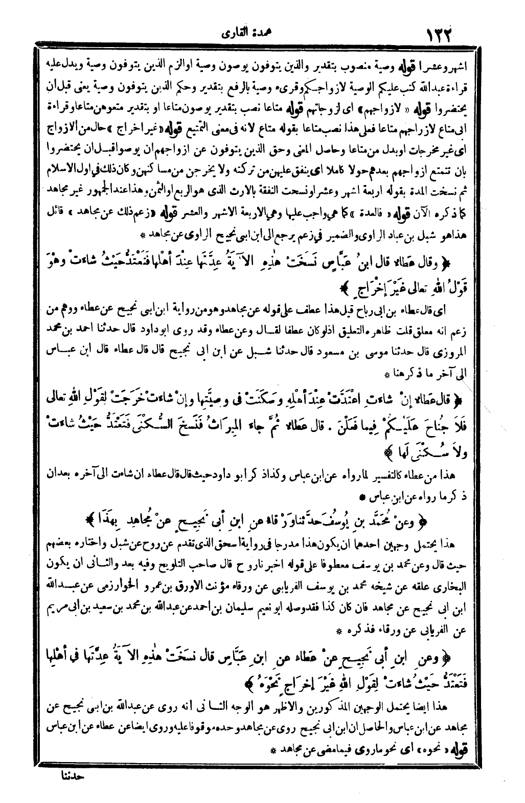 قَوْله: (كَانَت هَذِه الْعدة) ، أَشَارَ بِهِ إِلَى مَا فِي قَوْله تَعَالَى: {وَالَّذين يتوفون مِنْكُم ويذرون أَزْوَاجًا يَتَرَبَّصْنَ بِأَنْفُسِهِنَّ أَرْبَعَة أشهر وَعشرا} قَوْله: (فَأنْزل الله: {وَالذين يتوفون} ) ، فِي الْآيَة ذكرهَا ثمَّ قَالَ: (جعل الله لَهَا) أَي: للمعتدة الْمَذْكُورَة فِي الْآيَة الأولى (تَمام السّنة) وبحسب الْوَصِيَّة فَإِن شَاءَت قبلت الْوَصِيَّة وَتعْتَد فِي بَيت أهل الزَّوْج إِلَى التَّمام، وَإِن شَاءَت اكتفت بِالْوَاجِبِ، وَهَذَا يدل على أَن مُجَاهدًا لَا يرى نسخ هَذِه الْآيَة أَعنِي قَوْله: (ويذرون أَزْوَاجًا وَصِيَّة لأزواجهم) إِلَى آخرهَا وَعند الْأَكْثَرين هَذِه الْآيَة مَنْسُوخَة بِالْآيَةِ الَّتِي هِيَ قَوْله: {يَتَرَبَّصْنَ بِأَنْفُسِهِنَّ أَرْبَعَة أشهر وَعشرا} قَوْله: (وَصِيَّة) ، مَنْصُوب بِتَقْدِير: وَالَّذين يتوفون يوصون وَصِيَّة، أَو ألزم الَّذين يتوفون وَصِيَّة، وَيدل عَلَيْهِ قِرَاءَة عبد الله كتب عَلَيْكُم الْوَصِيَّة لأزواجكم، وقرىء وَصِيَّة بِالرَّفْع بِتَقْدِير: وَحكم الَّذين يتوفون وَصِيَّة، يَعْنِي: قبل أَن يحتضروا. قَوْله: (لأزواجهم) ، أَي: لزوجاتهم. قَوْله: (مَتَاعا) ، نصب بِتَقْدِير: يوصون مَتَاعا أَو بِتَقْدِير: متعوهن مَتَاعا وَقِرَاءَة أبي: مَتَاع لأزواجهم مَتَاعا، فعلى هَذَا نصب مَتَاعا بقوله: مَتَاع لِأَنَّهُ فِي معنى: التمتيع. قَوْله: (غير إِخْرَاج) ، حَال من الْأزْوَاج أَي: غير مخرجات، أَو بدل من: مَتَاعا. وَحَاصِل الْمَعْنى: وَحقّ الَّذين يتوفون عَن أَزوَاجهم أَن يوصوا قبل أَن يحتضروا بِأَن تتمتع أَزوَاجهم بعدهمْ حولا كَامِلا. أَي: ينْفق عَلَيْهِنَّ من تركته وَلَا يخرجهن من مساكنهن، وَكَانَ ذَلِك فِي أول الْإِسْلَام ثمَّ نسخت الْمدَّة. قَوْله: {أَرْبَعَة أشهر وَعشرا} (الْبَقَرَة: 234) ونسحت النَّفَقَة بِالْإِرْثِ الَّذِي هُوَ الرّبع أَو الثّمن، وَهَذَا عِنْد الْجُمْهُور غير مُجَاهِد كَمَا ذكره الْآن. قَوْله: (فالعدة) ، كَمَا هِيَ وَاجِب عَلَيْهَا وَهِي الْأَرْبَعَة الْأَشْهر وَالْعشر. قَوْله: (زعم ذَلِك عَن مُجَاهِد) ، قَائِل هَذَا هُوَ شبْل بن عباد الرَّاوِي، وَالضَّمِير فِي: زعم، يرجع إِلَى بن أبي نجيح الرَّاوِي عَن مُجَاهِد.