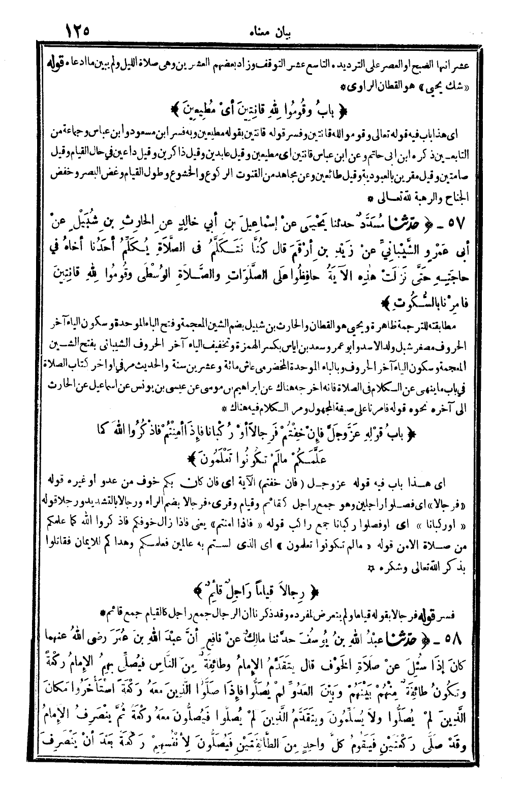 58 - (حَدثنَا عبد الله بن يُوسُف حَدثنَا مَالك عَن نَافِع أَن عبد الله بن عمر رَضِي الله عَنْهُمَا كَانَ إِذا سُئِلَ عَن صَلَاة الْخَوْف قَالَ يتَقَدَّم الإِمَام وَطَائِفَة من النَّاس فَيصَلي بهم الإِمَام رَكْعَة وَتَكون طَائِفَة مِنْهُم بَينهم وَبَين الْعَدو لم يصلوا فَإِذا صلوا الَّذين مَعَه رَكْعَة استأخروا مَكَان الَّذين لم يصلوا وَلَا يسلمُونَ ويتقدم الَّذين لم يصلوا فيصلون مَعَه رَكْعَة ثمَّ ينْصَرف الإِمَام وَقد صلى رَكْعَتَيْنِ فَيقوم كل وَاحِد من الطَّائِفَتَيْنِ فيصلون لأَنْفُسِهِمْ رَكْعَة بعد أَن ينْصَرف
