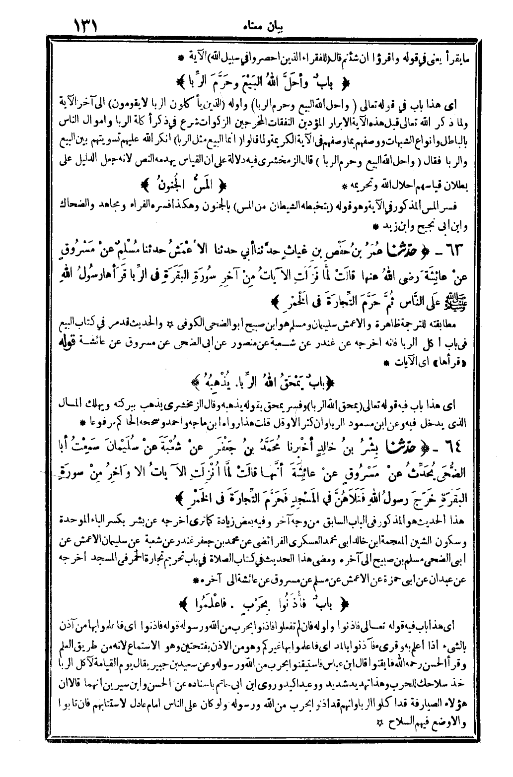 أَي: هَذَا بَاب فِي قَوْله تَعَالَى: {وَأحل الله البيع وَحرم الرِّبَا} وأوله: {وَالَّذين يَأْكُلُون الرِّبَا لَا يقومُونَ} إِلَى آخر الْآيَة، وَلما ذكر الله تَعَالَى قبل هَذِه الْآيَة الْأَبْرَار المؤدين النَّفَقَات المخرجين الزكوات، شرع فِي ذكر أَكلَة الرِّبَا وأموال النَّاس بِالْبَاطِلِ وأنواع الشُّبُهَات ووصفهم بِمَا وَصفهم فِي الْآيَة الْكَرِيمَة. وَلما قَالُوا: (إِنَّمَا البيع مثل الرِّبَا) أنكر الله عَلَيْهِم تسويتهم بَين البيع والربا فَقَالَ: {وَأحل الله البيع وَحرم الرِّبَا} . قَالَ الزَّمَخْشَرِيّ: فِيهِ دلَالَة على أَن الْقيَاس يهدمه النَّص لِأَنَّهُ جعل الدَّلِيل على بطلَان قياسهما إحلال الله وتحريمه.