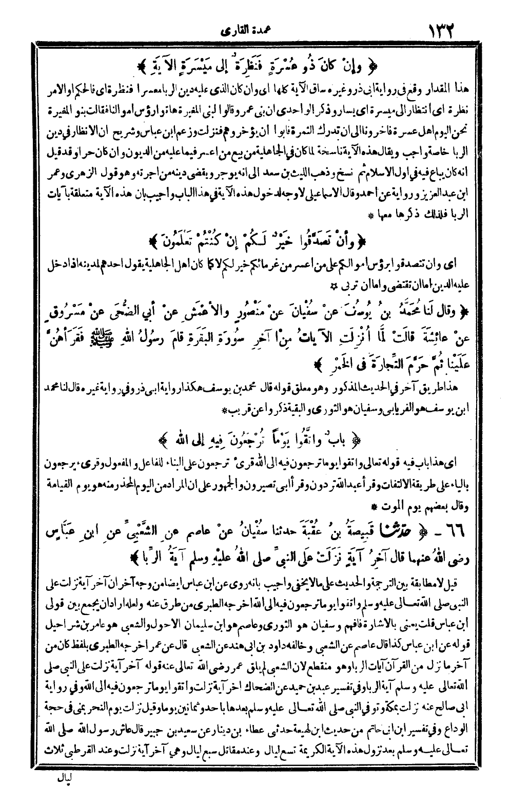4544 - ح دَّثنا قَبِيصَةُ بنُ عُقْبَةَ حدَّثنا سُفْيَانُ عنْ عَاصِم عنِ الشَّعْبِيِّ عنِ ابنِ عَبَّاسٍ رَضِيَ الله عَنْهُمَا قَال آخِرُ آيَةٍ نَزَلَتْ عَلَى النَّبيِّ صلى الله عَلَيْهِ وَسلم آيَةُ الرِّبا.