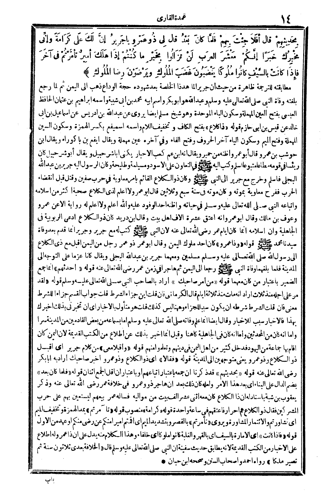 بِحَدِيثِهِمْ قَالَ أفَلاَ جِئْتَ بِهِمْ فَلَمَّا كانَ بَعْدُ قَالَ لِي ذُو عَمْروٍ يَا جَرِيرُ إنَّ لَكَ عَلَى كَرَامَةً وإنِّي مخْبِرُكَ خَبَراً إنَّكُمْ مَعْشَرَ العرَبِ لَنْ تَزَالُوا بِخَيْرٍ مَا كُنْتُمْ إذَا هَلَكَ أمِيرٌ تأمَّرْتُمْ فِي آخَرَ فإذَا كانَتْ بالسَّيْفِ كانُوا مُلُوكاً يَغْضَبُونَ غَضَبَ المُلُوكِ ويَرْضُونَ رِضا المُلُوكِ.
